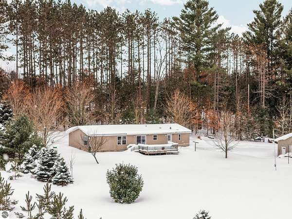 Discover space, privacy, and convenience with this 4-bedroom, 2-bath home offering 1,647 sq ft of comfortable living on 2.5 acres in desirable Kingsley, Grand Traverse County. The large primary bedroom features private access to a full bath, creating a relaxing retreat at the end of the day. Step outside to enjoy the expansive deck overlooking a mix of open and wooded land--perfect for entertaining, gardening, recreation, or future customization. The property provides both usable yard space and natural privacy. A standout feature is the 24'x40' detached garage with cement floor, electric, powered overhead door, and a second drive-through rear overhead door, ideal for storage, hobbies, or a workshop setup. Located in a beautiful rural setting while still just 20 minutes from Traverse City, this home offers the best of Northern Michigan living with room to grow and enjoy the outdoors.