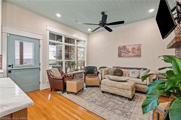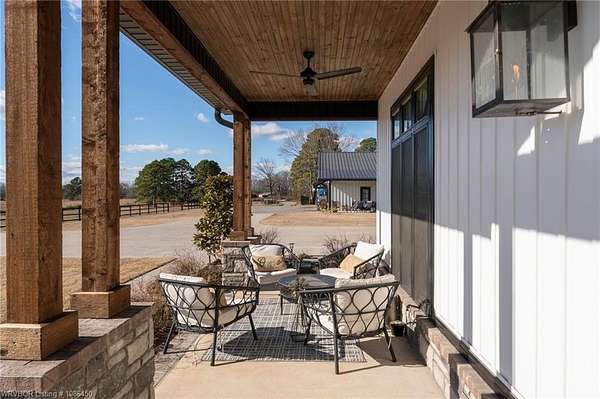 The kitchen includes custom cabinetry, expansive windows with a view, a large island, marble counters, and an Electrolux gas range with pot filler. You'll love the full chef's pantry with floor-to-ceiling (10') built-ins and brick herringbone flooring. The private master suite features a large walk-in closet, cast iron tub, huge shower with twin shower heads and a rainhead, dual vanities, and direct access to the backyard oasis. Three interior fireplaces: hearth room, living room and master bedroom. Additional highlights include coffered ceilings in the living area, locker area in the mud room, safe room, extra storage room that could be a 5th bedroom, and abundant natural light throughout. Enjoy exceptional outdoor living with large covered front and back porches, an outdoor kitchen with a 48" griddle/grill, sink, and bar seating for six, a double-sided fireplace, outdoor shower, and a designated hot tub space. The heated, saltwater pool allows for year-round swimming while taking in the property's long-range views. The 1,200 sq ft guest house was built in 2020 and offers 3 bedrooms, 2 baths, covered parking, and storage areas with potential for additional square footage. Property features also include a gated entrance, two metal shop buildings (36x40 and 36x46), a greenhouse, chicken coop, small orchard, private well (for the cottage & orchard), 1-bedroom cottage, fenced pastures for livestock, and a pond.