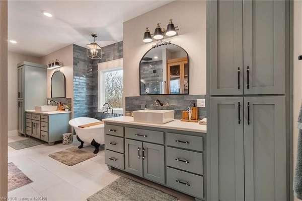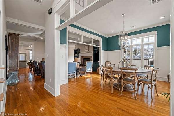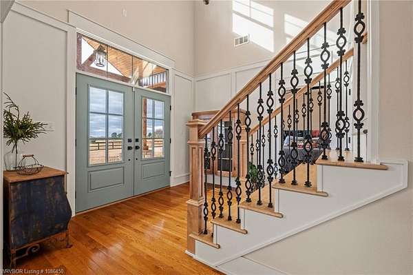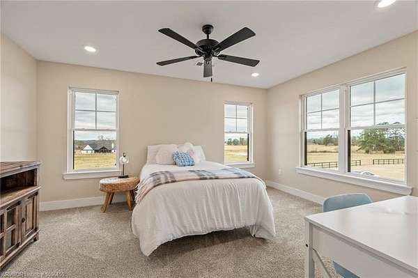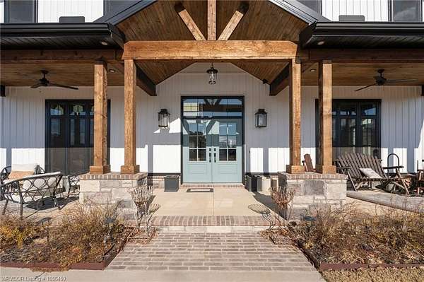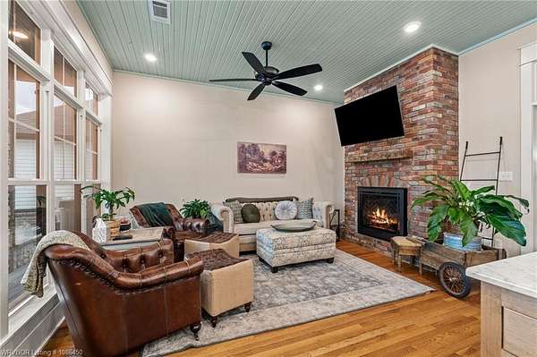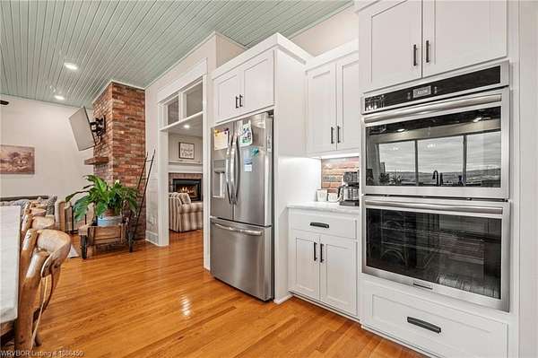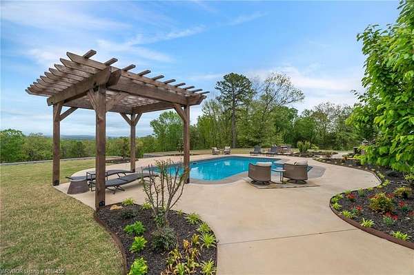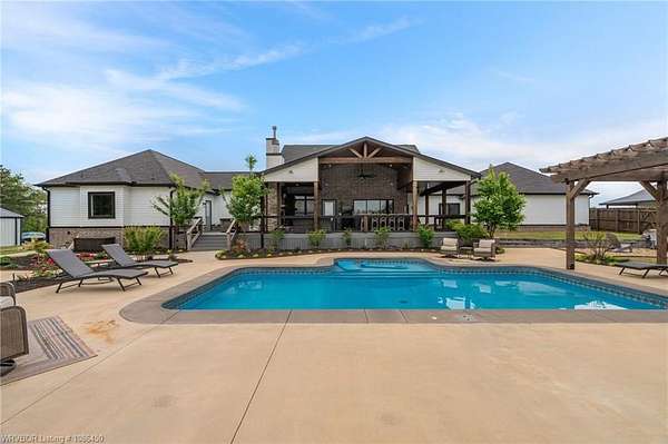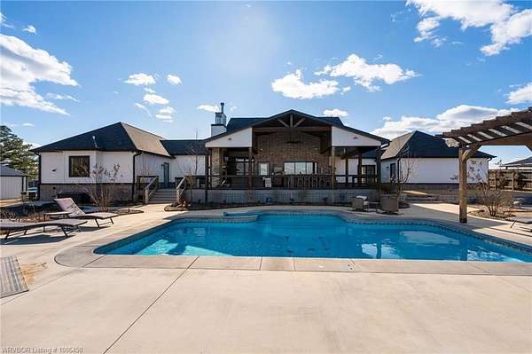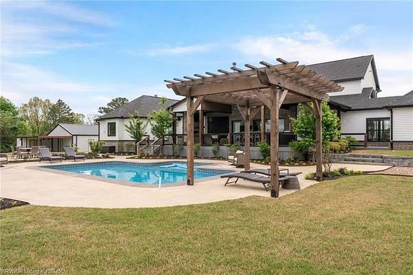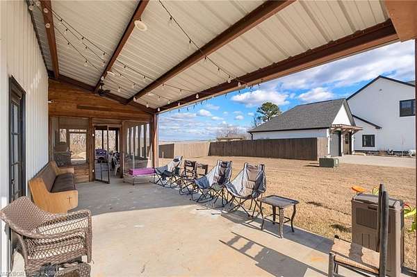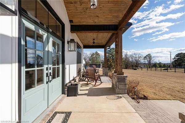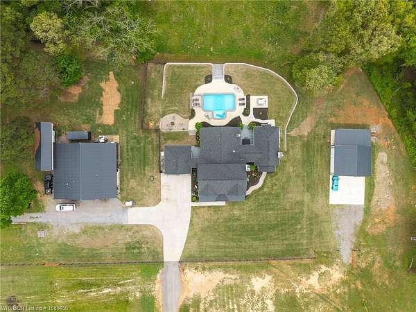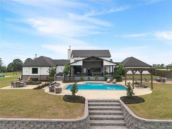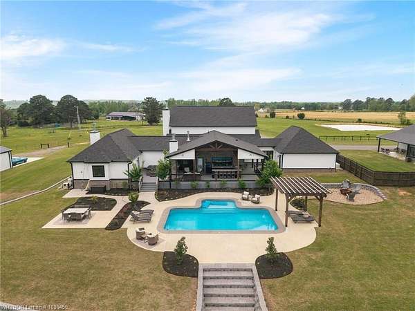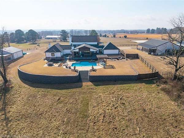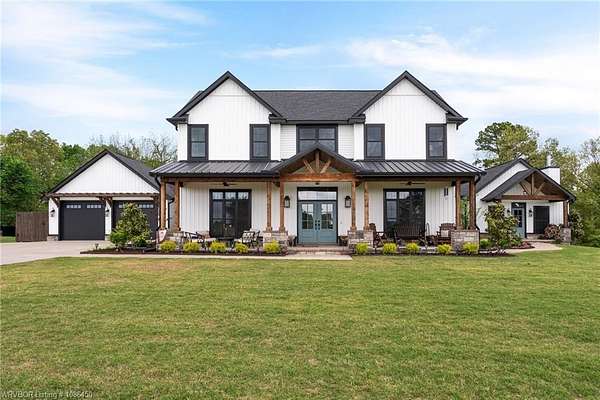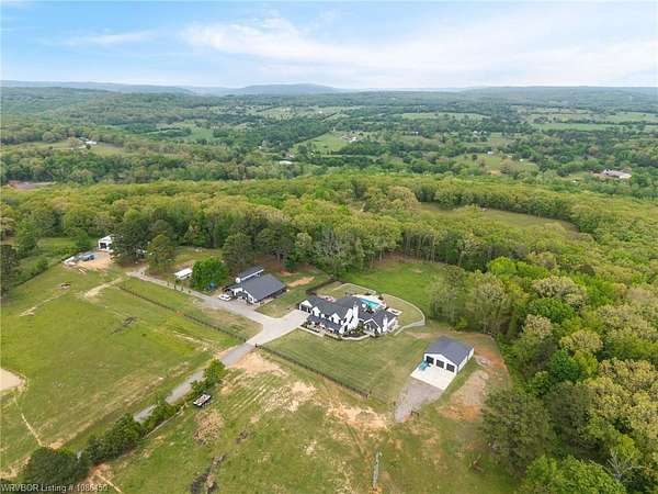 This 3,848 sq ft modern farmhouse sits on 11.3 beautiful acres just north of Alma. The home features 4 bedrooms, 3.5 baths, and exceptional attention to detail throughout. The kitchen includes custom cabinetry, expansive windows with a view, a large island, marble counters, and an Electrolux gas range with pot filler. You'll love the full chef's pantry with floor-to-ceiling (10') built-ins and brick herringbone flooring. The private master suite features a large walk-in closet, cast iron tub, huge shower with twin shower heads and a rainhead, dual vanities, and direct access to the backyard oasis. Three interior fireplaces: hearth room, living room and master bedroom. Additional highlights include coffered ceilings in the living area, locker area in the mud room, safe room, extra storage room that could be a 5th bedroom, and abundant natural light throughout. Enjoy exceptional outdoor living with large covered front and back porches, an outdoor kitchen with a 48" griddle/grill, sink, and bar seating for six, a double-sided fireplace, outdoor shower, and a designated hot tub space. The heated, saltwater pool allows for year-round swimming while taking in the property's long-range views. The 1,200 sq ft guest house was built in 2020 and offers 3 bedrooms, 2 baths, covered parking, and storage areas with potential for additional square footage. Property features also include a gated entrance, two metal shop buildings (36x40 and 36x46), a greenhouse, chicken coop, small orchard, private well (for the cottage & orchard), 1-bedroom cottage, fenced pastures for livestock, and a pond. This is a rare opportunity to own a custom-built estate with modern amenities, scenic views, and space for both relaxation and recreation.
