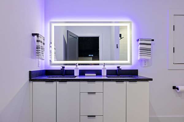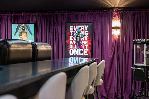 Relax and unwind in a state-of-the-art 14-seat theater, curtain-lined for an immersive experience, complete with a full kitchen and bath. The primary suite serves as a serene retreat, offering direct access to a spacious balcony overlooking the pool, a cozy gas fireplace, separate closets with a dedicated washer/dryer, a steam shower, soaking tub, Cambria marble counters, and heated floors.