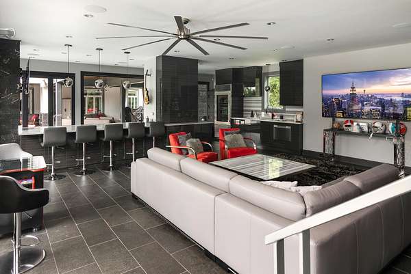 The backyard is anchored by a spectacular gunite pool and spa, featuring an infinity edge, waterfall, fire bowls, and a swim-up bar, creating a luxurious oasis. Adjacent is the incredible 2 story pool house, equipped with a full kitchen featuring Wolf/Sub Zero appliances. The first floor includes a bartender/server's well with a corner wall that opens directly to the swim-up bar, while the second story boasts a versatile game room or gym with its own powder room.