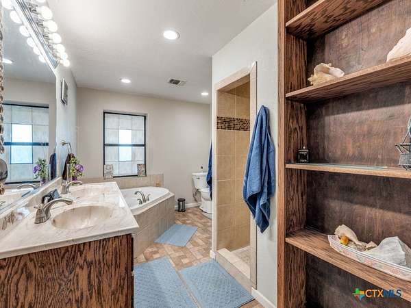 - All Bedrooms Down, Breakfast Bar, Built In Features, Ceiling Fans, Custom Cabinets, Double Vanity, His And Hers Closets, Jetted Tub, Kitchen Dining Combo, Kitchen Family Room Combo, Multiple Closets, Pantry, Walk In Closets
