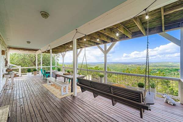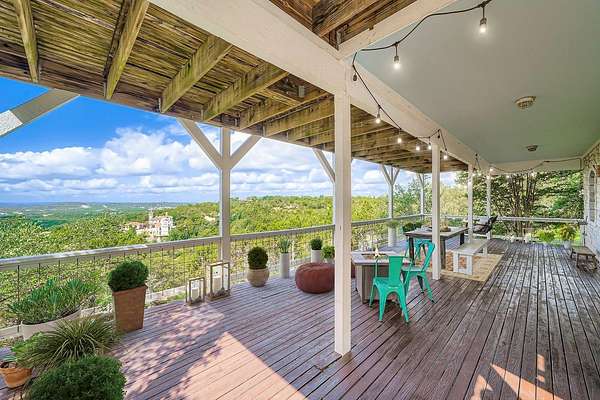 Own the View Few Will Ever See - a Private Hill Country Unicorn. This is the kind of property people whisper about: a privileged, virtually unrestricted 2.5-acre hilltop above Lake Travis with two expansive view decks delivering cinematic lake and Hill Country panoramas. No HOA, no permits required for STRs - you have rare, literal freedom to use the land as you please. Connected to city water, equipped with high-speed internet, and a new septic system in 2025, it's as turnkey as it is timeless. 40 minutes from downtown Austin, 15 minutes to Cedar Park (Costco, HEB, Whole Foods, restaurants & shopping), and 5 minutes to Lago Vista (Lucky Rabbit, Boat Ramps & Parks), it's secluded without being distant. Step inside the stone-clad home and the horizon becomes your interior design: six picture windows and vaulted ceilings flood rooms with light while framing day-to-night views that change like a private performance. The updated kitchen, two bedrooms, two marble-topped baths, and a hidden Murphy bed marry luxury with practical flexibility for guests or family. A detached 200 sq ft studio with A/C and its own two-car carport is a private sanctuary-office, art or music studio, or quiet guest quarters-giving you the power to separate work and life without leaving home. Secure black-metal fencing, dual gated entries, and graceful oaks provide privacy and permanence. Curated landscaping, raised gardens alive with butterflies and hummingbirds, and ample space to build another residence or multi-home compound complete the picture. Properties that combine these views, this level of freedom, and this proximity to Austin are effectively irreplaceable. Owner is a licensed Realtor in the state of Texas. Buyer to verify all information.