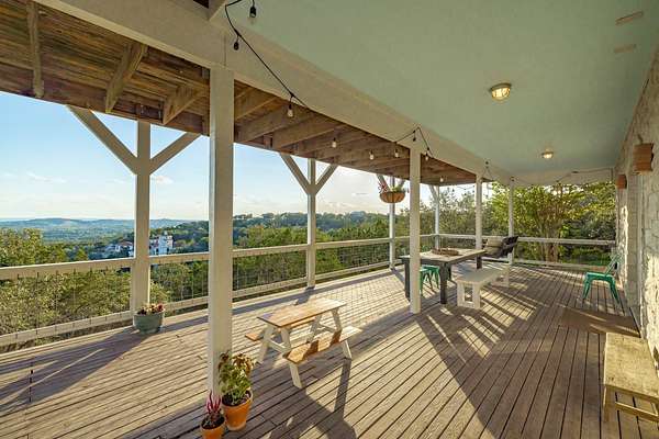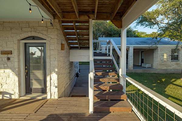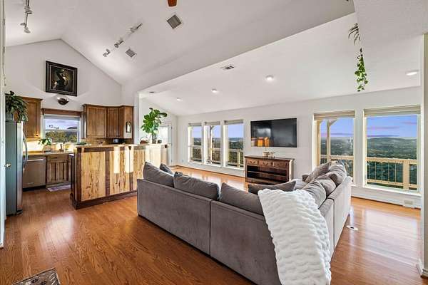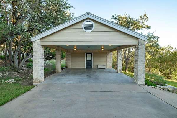 See 15 miles from your living room! The photos don't do justice to this view, you have to see in person! Virtually unrestricted 2.45-acre hilltop above Lake Travis with two expansive view decks delivering cinematic lake and Hill Country panoramas. No HOA, no permits required for STRs - you have rare freedom to use the land as you please. Connected to city water, equipped with high-speed internet, and a new septic system in 2026, it's as turnkey as it is timeless. 40 minutes from downtown Austin, 15 minutes to Cedar Park ("The Parke" - Costco, HEB, Whole Foods, Target, restaurants & shopping), and 5 minutes to Lago Vista (Lucky Rabbit, Boat Ramps & Parks), it's secluded without being distant. Step inside the stone-clad home and the horizon becomes your interior design: six picture windows and vaulted ceilings flood rooms with light while framing day-to-night views that change like a private performance. The updated kitchen, two bedrooms, two marble-topped baths, and a hidden Murphy bed offer practical flexibility for guests or family. A detached 200 sq ft studio with A/C and its own two-car carport is a private sanctuary-office, art or music studio, or quiet guest quarters-giving you the power to separate work and life without leaving home. Secure black-metal fencing, dual gated entries, and graceful oaks provide privacy and permanence. A naturalist dream! Beautiful native landscaping, roses bushes, fruit trees, 7 organic raised garden beds alive with butterflies and hummingbirds. Ample space to build another residence or multi-home compound complete the picture. Properties that combine these views, this level of freedom, and proximity to Austin are as unique as they are rare. Lago Vista ISD. Low 1.71 tax rate and no city taxes, property is in the ETJ. Owner is a licensed Realtor in the state of Texas. Buyer to verify all information.