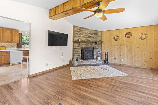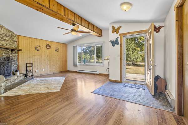 Enjoy the serenity of the countryside in this ranch-style home, perfectly situated on almost 3 acres with easy access from a paved road. The home features a walk-out basement, offering potential for additional living space or in-law suite. All appliances stay, making your move-in seamless and stress-free. You'll appreciate the abundant storage throughout, both inside and out plus an attached 2 car garage with workshop. Picture yourself in front of the fireplace enjoying a beverage or BBQ on the back deck watching wildlife meander through your yard. An extra piece of mind the metal roof was installed in 2023. With immediate occupancy available, you can start enjoying this peaceful, private setting right away! Call to set your appointment to see this home and make it yours!
