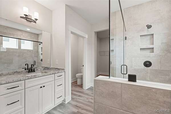 The Edgefield is a ranch home featuring four bedrooms, three-and-a-half baths, and a side-load garage. A dining area with hardwood flooring is located directly off the foyer. A spacious kitchen with granite counters, hardwood floors, an island, and a walk-in pantry is open to an adjoining dining area. The cozy family room features a gas fireplace and a home office with glass French doors and hardwood floors. The primary bedroom features a large walk-in closet and an ensuite bath with a tiled, LUXURY shower with a seat, dual vanities, a water closet, and a linen closet. Bedrooms 2 and 3, both with walk-in closets, share a full hall bath with a walk-in shower with a bench seat. A laundry room, a powder room, and a screen porch complete the first floor. The second floor offers a fourth bedroom, a full bath, and loft area. Lake Margaret at The Highlands is a charming, age-restricted neighborhood tucked in the lovely golf course community at The Highlands in Chesterfield, VA. In addition to the stunning grounds and facilities at the championship 18-hole golf course, Lake Margaret at The Highlands offers three lakefront pools with a clubhouse, tennis courts, trails, a playground, and two lakes totaling over 100 acres of opportunity for fishing, paddling, and canoeing. Plus, the convenient location between Richmond and Petersburg offers dining, shopping, and entertainment just around the corner.