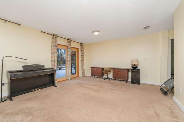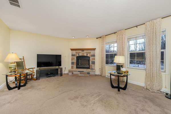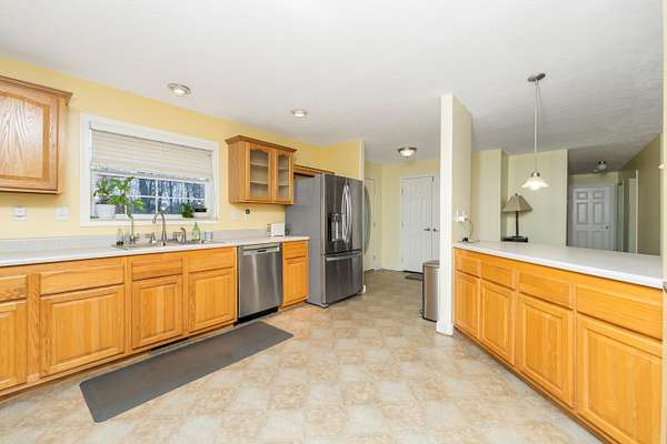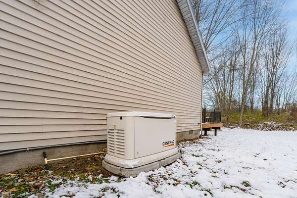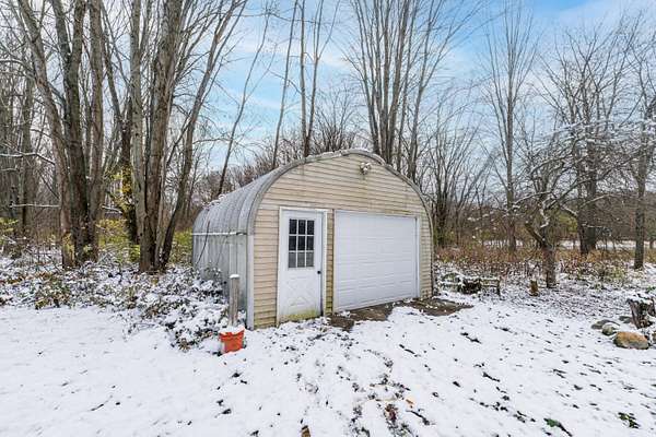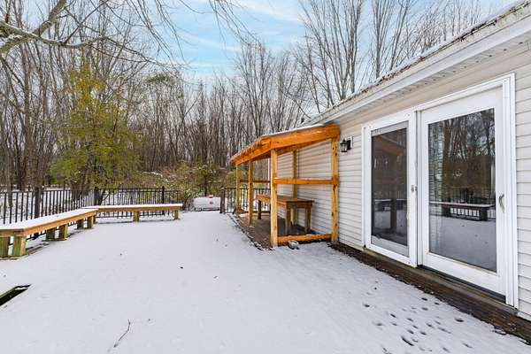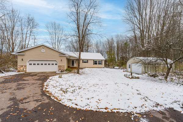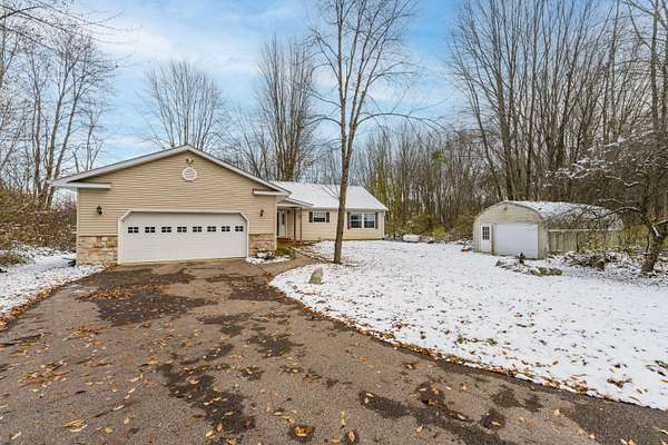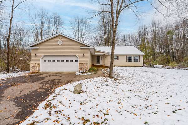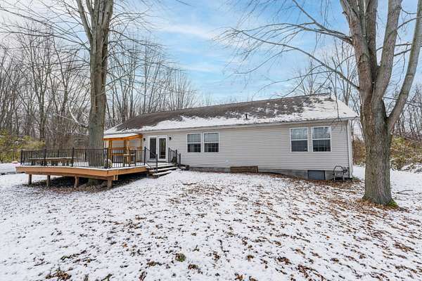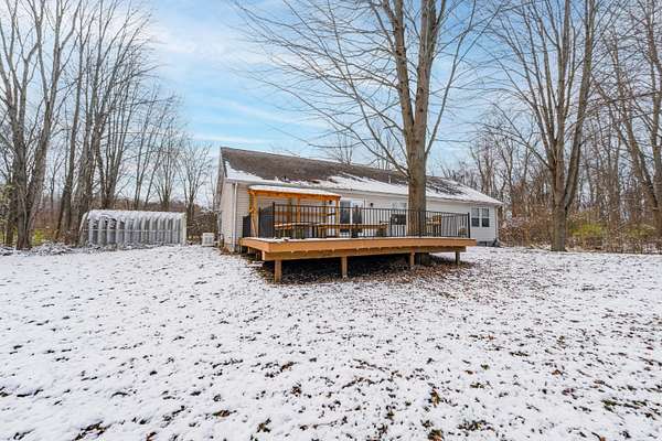 Escape to tranquility in this beautiful, spacious 1,800 sq ft ranch home, perfectly set on a generous 1.636-acre wooded lot, surrounded by a canopy of mature trees for unparalleled privacy and abundant wildlife viewing. The home features a large, inviting living room anchored by a cozy fireplace and a spacious, updated kitchen equipped with brand-new stainless steel appliances. A private primary suite is complemented by two additional full bathrooms. Outdoor living is easy on the expansive large deck, while the home offers excellent utility with an attached two-car garage, a substantial additional hoop barn for storage or hobbies, and plenty of easy-access storage space in the attic. This property perfectly blends comfortable, single-level living with a serene, nature-filled setting.