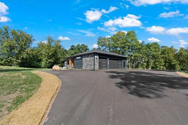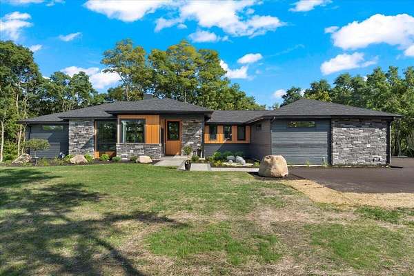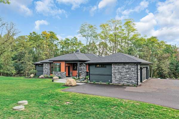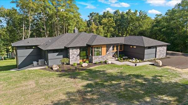 Luxurious Award Winning home set on 4.58 private, wooded acres with tranquil lake views, this modern estate blends architectural sophistication with everyday livability. Thoughtfully designed and impeccably built, the home balances elegance, comfort, and advanced technology in a serene setting. The chef's kitchen features premium JennAir appliances, quartz countertops, custom cabinetry, and a built-in Miele espresso machine, ideal for entertaining. A sunroom offers retreat. The primary suite includes a spa-inspired bath with heated floors. The walk-out lower level features fitness and wellness areas. Additional highlights include smart-home integration, security cameras, and a whole-home generator. Enjoy privacy access to I94.