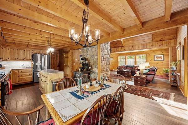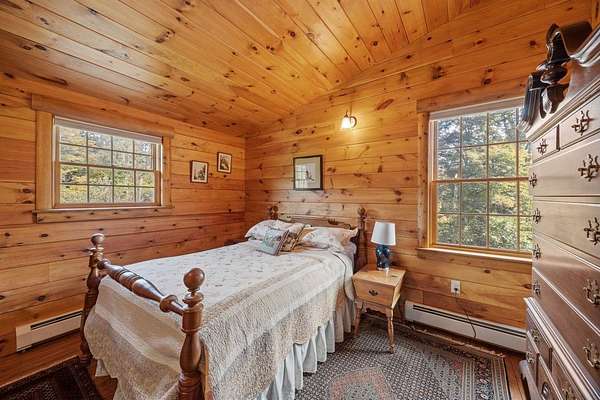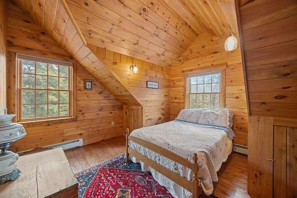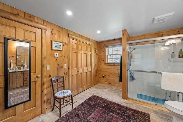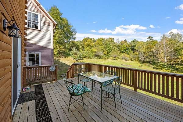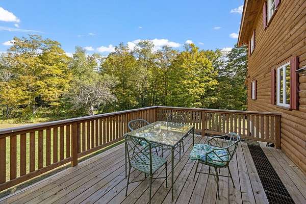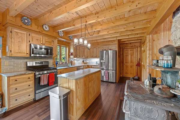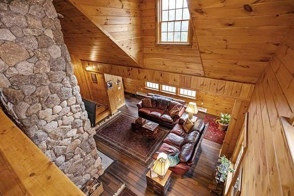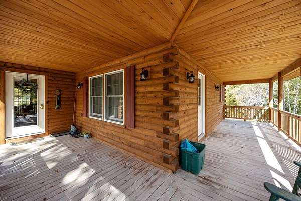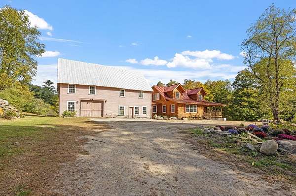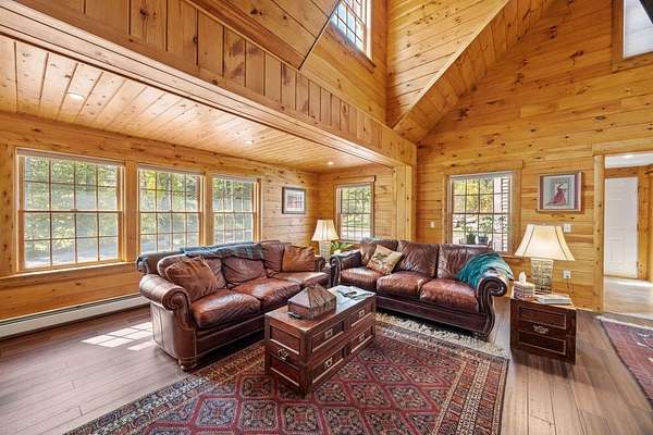 Built in 2023 and set on 5.5 private acres, this modern log home with a standing seam metal roof is the ultimate nature retreat with easy access to I-93. The interior impresses immediately with cathedral ceilings and a soaring floor-to-ceiling stone fireplace in the spacious living room. The heart of the home is a chef’s kitchen featuring granite countertops, stainless appliances, a central island, and a charming Glenwood cookstove. Just off the dining area, a slider opens to the back deck—the perfect spot for morning coffee while watching for local wildlife. Designed for effortless one-story living, the main floor includes a primary suite with a walk-in shower, granite vanity, and private access to the covered porch. This level also hosts a half-bath/laundry room and entry to an expansive 1,334 sq. ft. attached post-and-beam barn. Upstairs, a bright loft overlooks the living area, leading to two additional bedrooms and a full bath. The finished lower level adds even more versatile space with a family room, 3/4 bath, a bedroom and a bonus room perfect for an office. Showings to begin on 4/15 so schedule your private viewing!