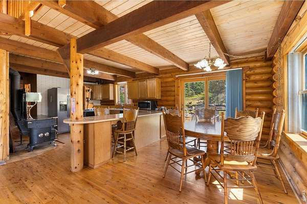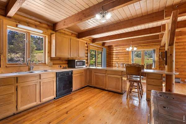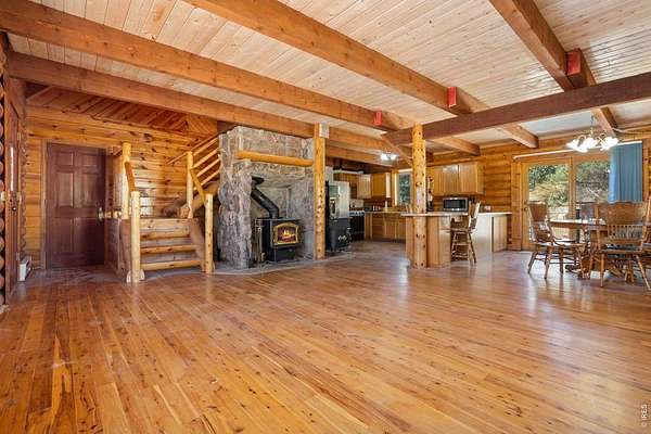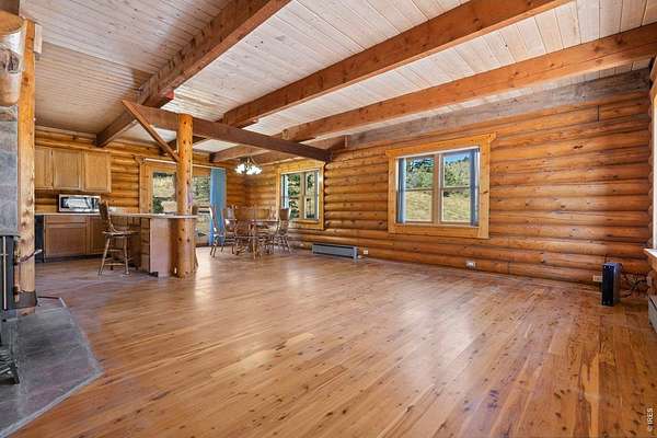 This stunning 3 bedroom log home is nestled on 35 acres of beautiful land, offering breathtaking views and endless possibilities. Featuring rustic charm and modern amenities. Part of the basement can be finished for more living space. Outside, you'll find two large metal outbuildings - one 27X43 and another 27x48 - ideal for hay storage, a small business, or workshop space. The property also boasts a deluxe chicken coop (the Ritz-Carlton of coops!), a two-stall horse barn that can store 8 large bales of hay, a fenced corral, and ample pasture where horses can roam freely. Rabbit Creek runs thru the property and the front pasture grows hay that can be cut. Additional features include a 5th wheel RV setup, fully connected to septic, water, and power - perfect for guests or for comfortable living while remodeling the main house. This is a one-of-a-kind opportunity to own a versatile property with space, beauty, and functionality. Schedule your showing today!