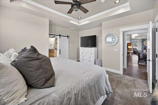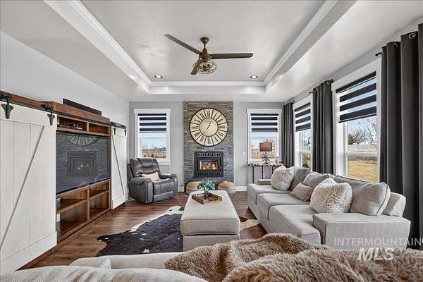 Extraordinary private retreat nestled on 5 acres with NO HOA! Gated, custom built home is perfectly situated to take in the panoramic mountain views & was thoughtfully designed for privacy, multi-generational opportunities, & elevated living with flexible bedroom configurations, A hidden door leads to flex space in basement for office, rec, or creating a 5th bed. A spacious bonus-level retreat w/balcony, half bath, & wet bar, is perfect for movie nights/extra guests. The kitchen anchors daily life w/a raised leathered granite island, double ovens, & walk-in pantry. Step out to the back patio and take in beautiful sunrise views, while the charming upper balcony provides a peaceful perch to take in evening sunsets & starry nights. Exceptional infrastructure throughout this property! The fully finished/insulated 1529 Sq Ft garage has pull through RV bay with a wood stove & utility sink. Also two additional RV pads with hookups and a 41x26 powered shop-ideal for hobbies, storage, or equipment. Smart-home technology, Vivint security, & energy-efficiency contribute to year-round comfort and performance. Potential for an ADU up to 1,250 sq ft & open pasture for horses add flexibility. With NO HOA, a private well, and an agricultural tax exemption in place, enjoy both lifestyle freedom & valuable tax advantages. Please see docs for features & click tour link for 3D, aerial, and more info!