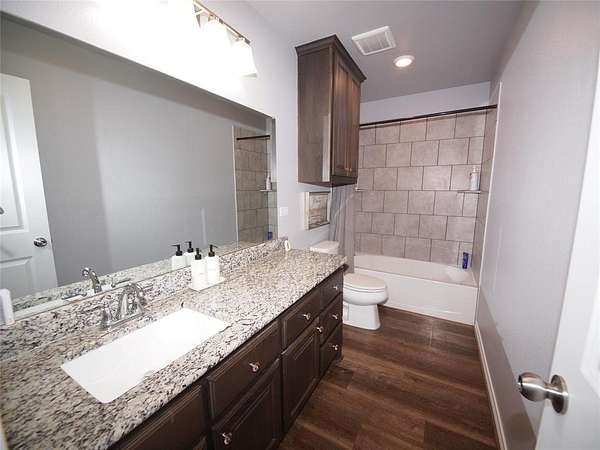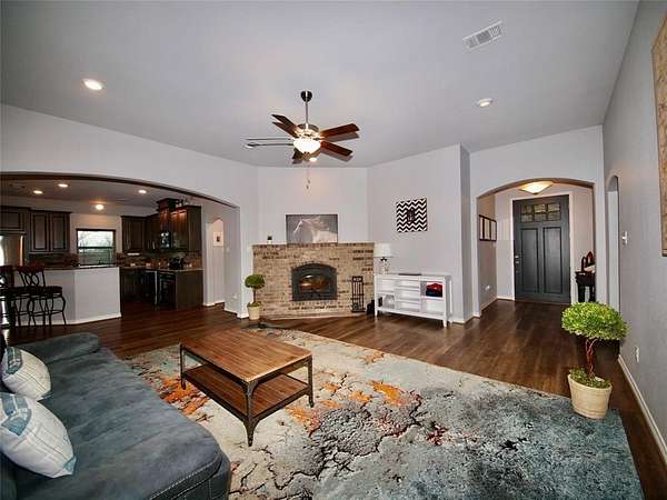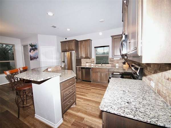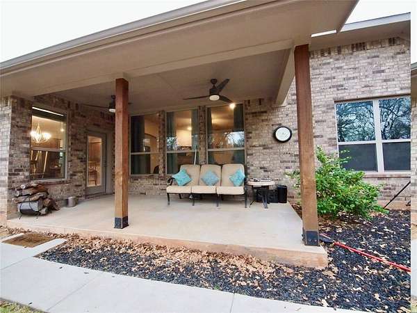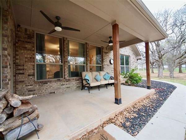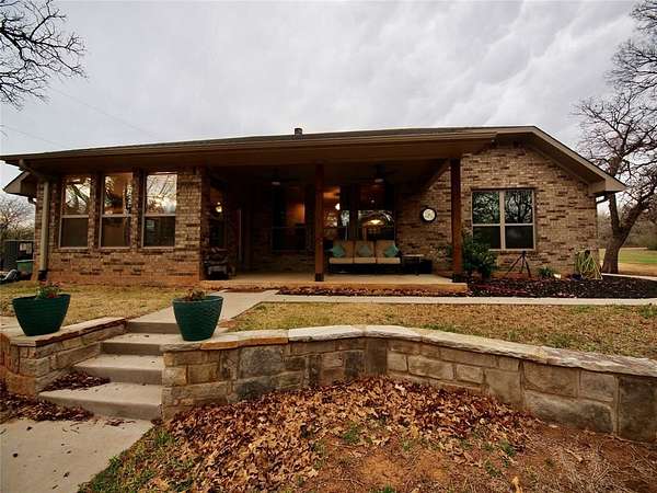 Gorgeous, move-in ready, custom built three bedroom, two bathroom brick home on 3.73 acres m-l in the heart of Bryson, Texas! This amazing home was built in 2020 and offers 1,925 sq.ft. of living area with a split bedroom arrangement floor plan and open concept kitchen, dining and den that is perfect for entertaining family and friends. You'll fall in love with this home from the moment you enter through the grand Craftsman style Mahogany front door into the inviting entryway and onward into the captivating den with luxury vinyl plank flooring, brick corner fireplace with wood-burning insert, recessed lighting and windows overlooking the peaceful, private backyard. The well-appointed kitchen features Granite countertops, thin brick veneer backsplash, a huge island with barstool seating, under-mount stainless steel sink, built-in dishwasher, smooth surface electric range, built-in microwave, recessed lighting and a walk-in pantry. An adjoining dining area has windows overlooking the backyard and an exit door to the oversized covered patio, perfect for relaxing after a busy day. The primary bedroom boasts carpet, a lighted ceiling fan and a luxury ensuite with a large vanity with Granite countertop, dual sinks, dual shower with ceramic tile surround, HUGE walk-in closet and water closet. The two guest bedrooms offer carpet, lighted ceiling fans and share a hall bathroom with an oversized vanity with sink and tons of storage, tub-shower with tile surround and a toilet. The utility room has built-in cabinets, washer and dryer connections and ample room for a freezer. Central heat and air. Spray foam insulation. Engineered foundation to bedrock. The backyard is a nature lovers paradise with mature Oak and Elm trees, a fire pit, a concrete slab for use as a children's play area or a pad to place your own storage building or green house! Plenty of space to add your very own workshop, swimming pool, vegetable garden or whatever your heart desires!