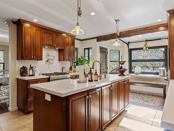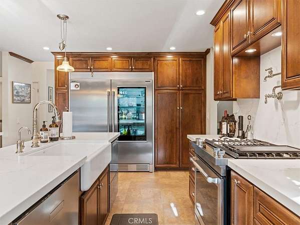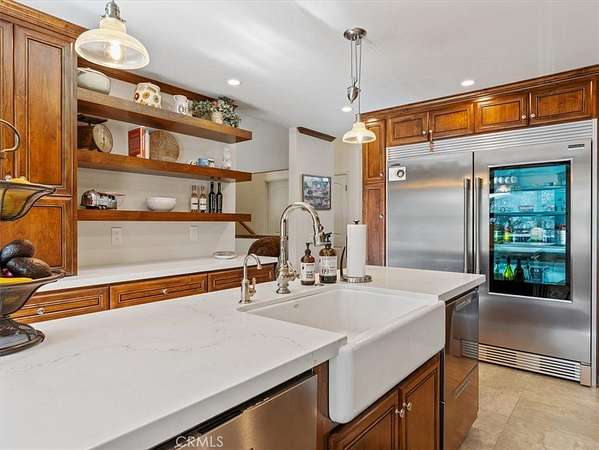 The gourmet kitchen showcases quartz countertops, custom wood cabinetry, a Jenn-Air gas range, dual ovens, built-in side-by-side refrigerator/freezer, and three dishwashers. A garage-style roll-up window opens to the backyard seating area, creating seamless indoor-outdoor flow.