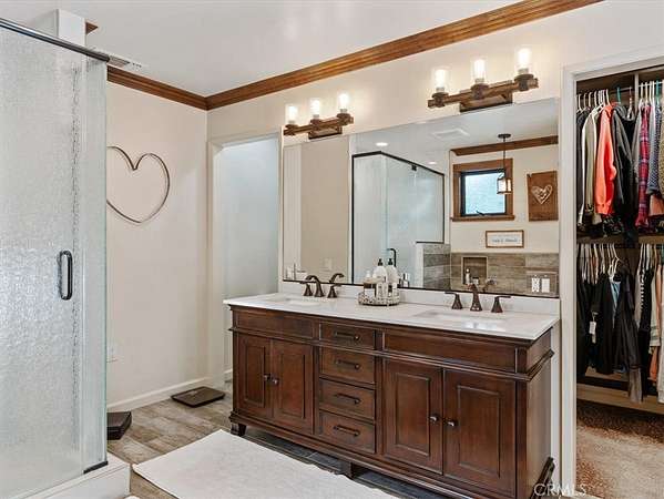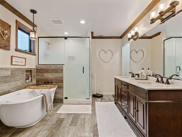 The primary suite offers a spa-inspired bath, dual vanities, soaking tub, and walk-in closet. An oversized living room provides flexible space for a media room, game room, or additional gathering area.