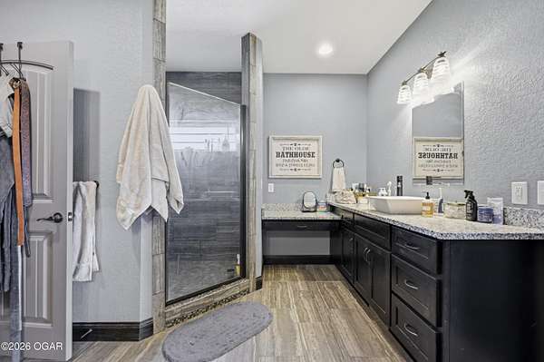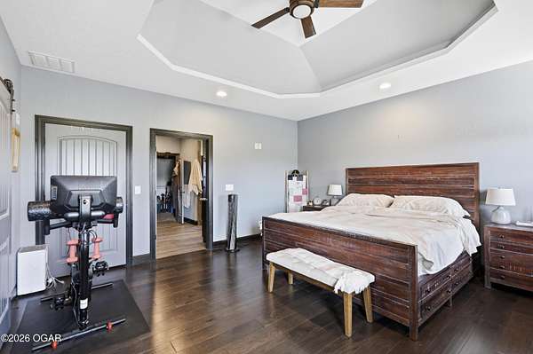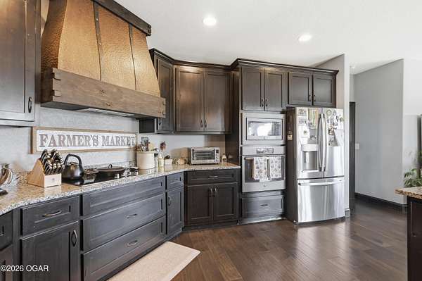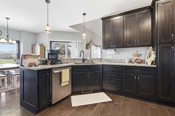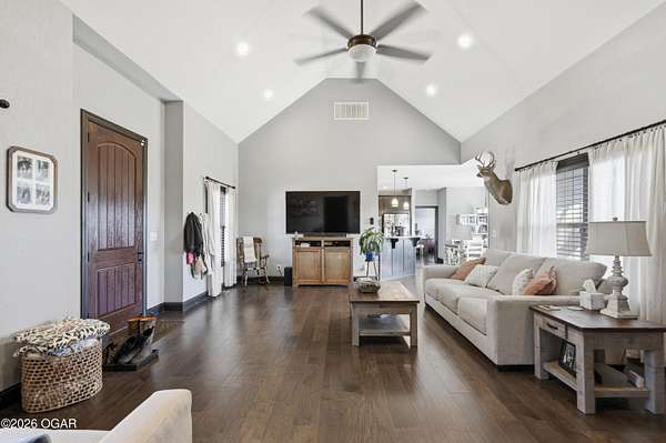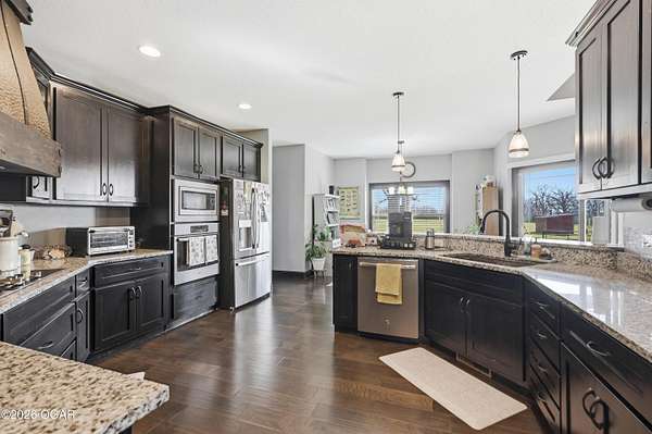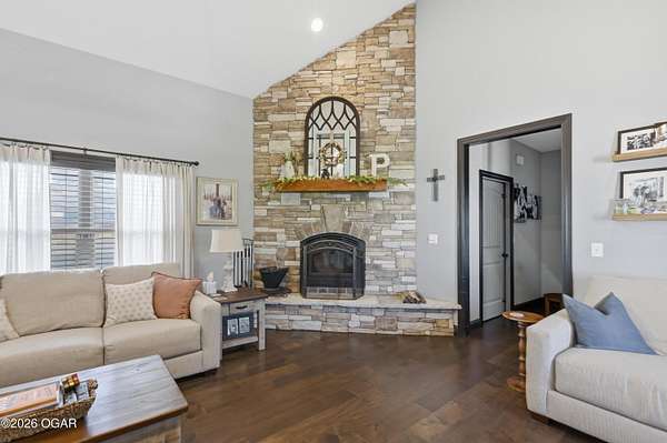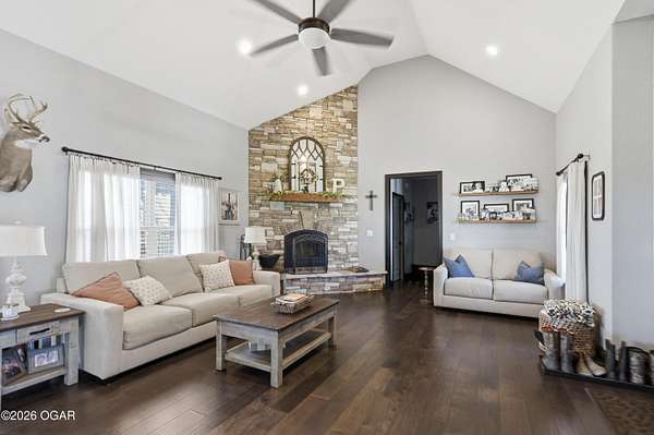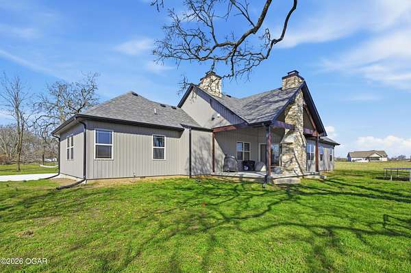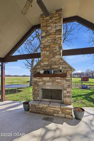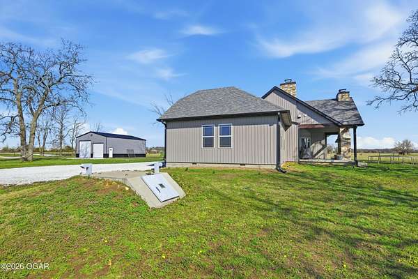 Discover luxury country living with this beautiful 4-bedroom, 2-bath home situated on 4.7 acres. The home offers two spacious living areas, providing plenty of room for relaxing or entertaining. The main living room features vaulted ceilings and a cozy wood-burning fireplace, and beautiful wood flooring creating a warm and inviting atmosphere.The kitchen is designed for both function and style, showcasing granite countertops, stainless steel appliances, and an eat-at bar top perfect for gathering with family and friends.The primary bedroom suite offers a private retreat with trayed ceilings, walk-in closets, and an en suite bathroom featuring a tiled walk-in shower.Step outside to enjoy the covered back patio with a stunning rock outdoor wood-burning fireplace, ideal for entertaining or quiet evenings outdoors. Home has an indoor storm room, outdoor storm shelter, water softner, 30x40 detached garage/workshop with electric/plumbing and a shed for additional storage. A Lean to for hobby farmers, with piped fencing!