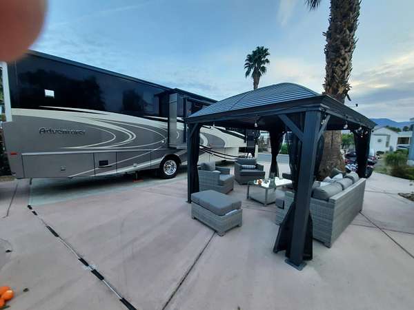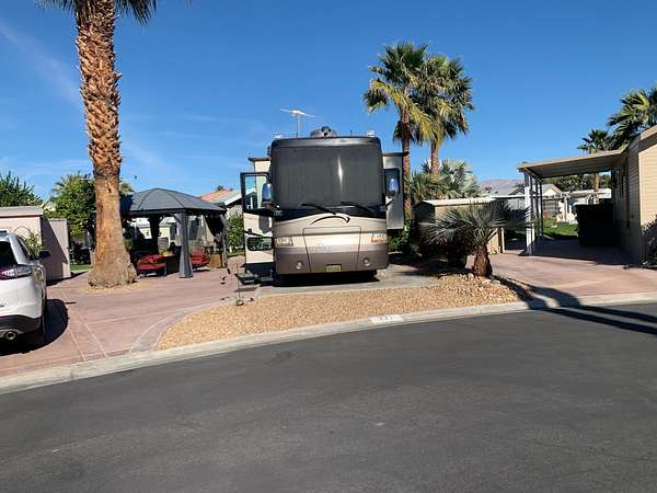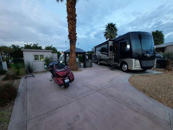 If you are looking for an exceptional RV lot in Desert Aire then this is it!! This lot is an oversized pie shaped lot with a small view of one of the many water features in Desert Aire. There is stamped concrete on the large parking pad and is one of the few interior rv lots that will accommodate a 45 foot RV. This is a very private lot with no yard work or maintenance. Some of the features are a newer Tuff Shed which is completely drywalled on the inside and is set up for a washer and dryer if desired. The shed is also the largest size allowed in Desert Aire. Last season the electrical pedestal was upgraded with new breakers and panel. There is a large maintenance free pergola that is included in the price. This is a perfect lot for entertaining your friends in Desert Aire.
