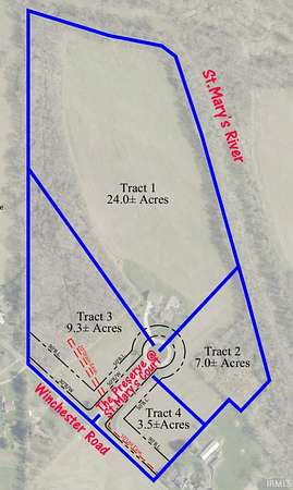 PUBLIC AUCTION Thursday February 26th | @ 6:00PM EST Custom Built Home, Outbuilding, Wooded & Tillable Land, Prime Building Lots To be sold in multiple tract combination! Open House: Tuesday February 3rd | 4PM-6PM Tract 1 - Custom Brick Home on 24.0+- Acres Experience country living at its finest in this 3,796 sq ft custom-built, 3 Bed, 2 Full, 2 Half Baht, all-brick home set on approximately 24 acres of tillable and wooded land with scenic nature trails along the St. Mary's River! Tract 2 - 7.0+- Acres | Riverfront Building Site Build your dream home on this prime riverfront location along the St. Mary's River. The lot is partially wooded, offering natural privacy and scenic beauty, Sewer Access Tract 3 - 9.3+- Acres | Corner Frontage Building Site An appealing mix of tillable and wooded acreage featuring an excellent building site with prominent frontage along Winchester Road and St. Mary's Court, Sewer Access Tract 4 - 3.5+- Acres | Corner Frontage Building Lot A tillable, corner acreage offering another prime building opportunity with frontage along Winchester Road and St. Mary's Court, Sewer Access