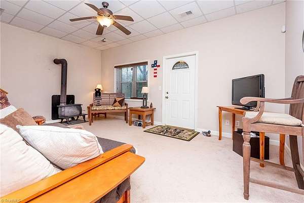 Nestled on 7 serene acres with a meandering creek, this 1.5-story home offers the perfect blend of rustic charm and modern comfort. The home showcases an open great room with soaring vaulted ceilings and a dramatic wall of windows that flood the space with natural light and offer peaceful views of the wooded surroundings. The main level features hardwood floors, a spacious living and dining area, and a well-equipped kitchen with solid wood cabinetry and stainless steel appliances. The finished walk-out basement adds valuable living space, ideal for a game room, den, or additional guest quarters. Offered fully furnished, this home is move-in ready—perfect for a full-time residence, weekend retreat, or vacation rental. Enjoy the outdoors from the expansive back deck or relax on the covered lower patio. Multiple storage buildings and gently sloping landscape and creek create an idyllic setting for gardening, exploring, or simply enjoying the beauty of nature.