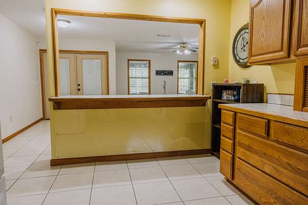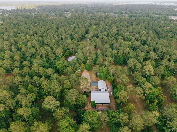 A long, private dirt drive winds through the trees, creating a true sense of arrival. The four-bedroom, three-bath home, built in 1999, sits on a gentle hill outside of any flood zone. It features tile flooring throughout, recessed lighting, French doors, a game room, and a spacious living and dining area perfect for entertaining or family gatherings. The screened porch, covered patio, and open deck extend the living space into the landscape, offering panoramic views of the lake.