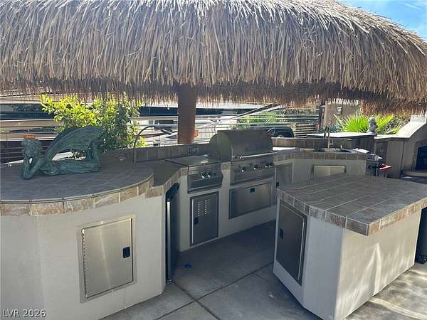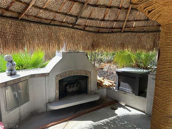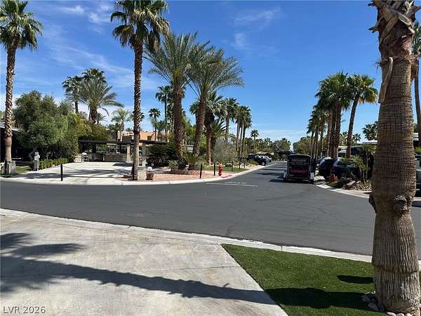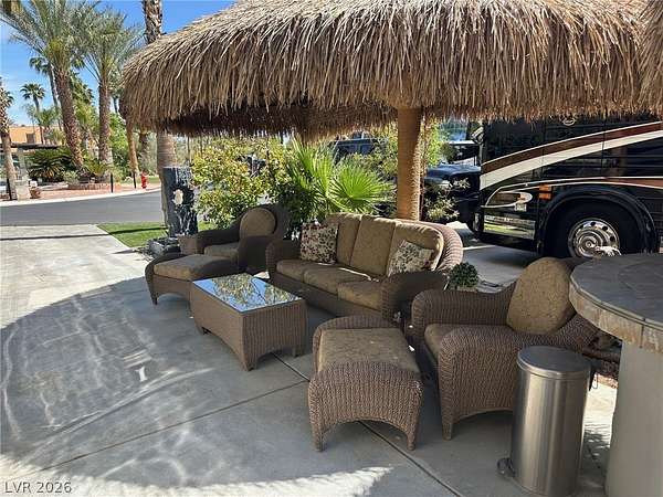 Lot 106 at the prestigious guard-gated Las Vegas Motorcoach Resort offers an exceptional blend of luxury, comfort, and prime location. Ideally situated adjacent to the resort’s main clubhouse, pool, fitness center, pickleball courts, and an array of upscale amenities, this beautifully appointed lot is designed for both relaxation and entertaining. The outdoor living space features a well-equipped kitchen beneath charming shade palapas, a spacious living room area with a cozy fireplace, and a convenient storage shed. Surrounded by lush, mature landscaping, this lot provides a private oasis while keeping you in close proximity to the vibrant heart of the resort.