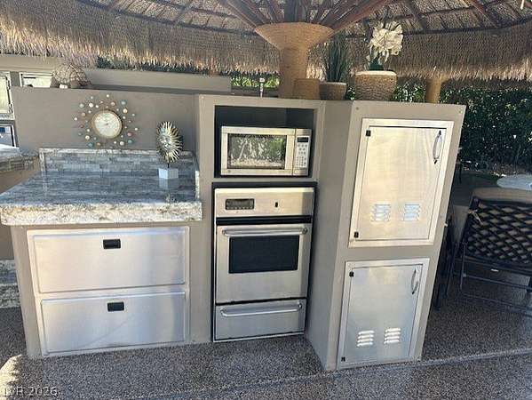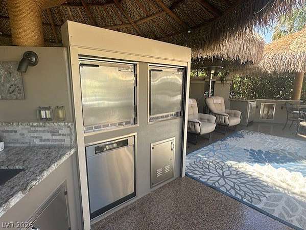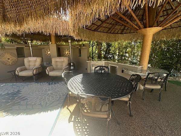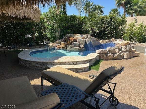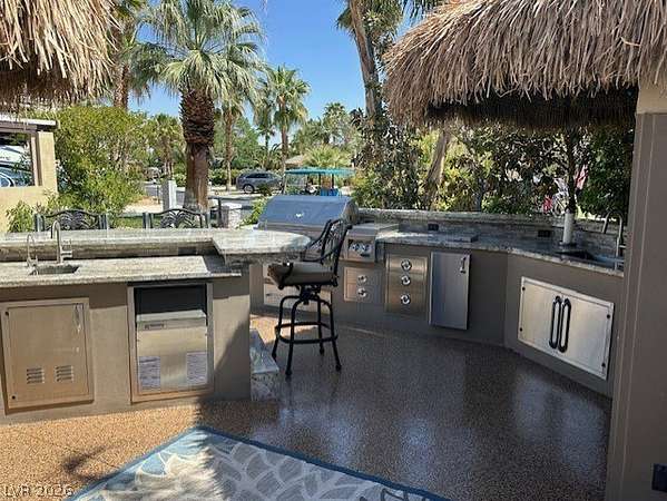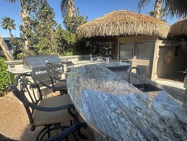 Located in the Las Vegas Motorcoach Resort, this is the ultimate site!!! This large and private corner site is about as good as it gets! The only site in the resort with a large water feature, this amazing site is outfitted with newly thatched palapas, mature landscaping, huge outdoor kitchen w/Miele dishwasher, warming drawer, Beverage-Air commercial grade refrigerator and freezer, granite counters, huge living room, fireplace, storage, reverse osmosis, water softener, custom fit covers, and much more!