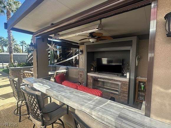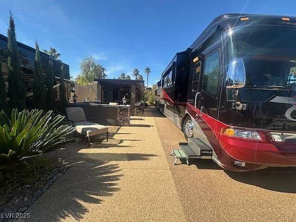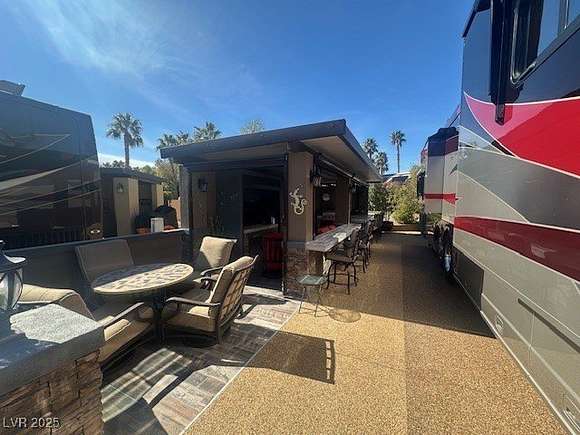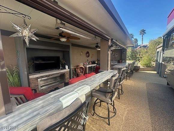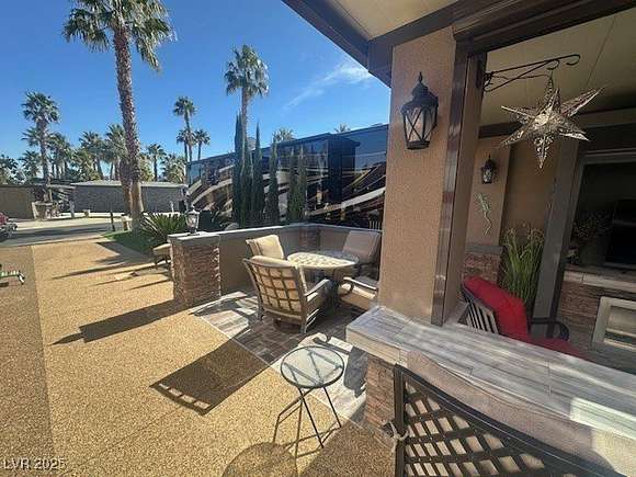 Located in the guard gated Las Vegas Motorcoach Resort, this site offers the perfect blend of luxury and convenience. Featuring hard roof structures and motorized shades, this exceptional lot creates a private, comfortable outdoor retreat. The beautifully appointed full kitchen and spacious living room with TV and fireplace provide the perfect space for relaxation and entertaining. A well-maintained comfort station adds convenience, while the stunning Pebble Tec driveway enhances the lot's appeal. Ideally located close to the main clubhouse and pool, you'll have easy access to all the resort's top-tier amenities. This is your chance to own a piece of paradise in one of the country's most exclusive motorcoach resorts, offering both comfort and style for your ultimate getaway.