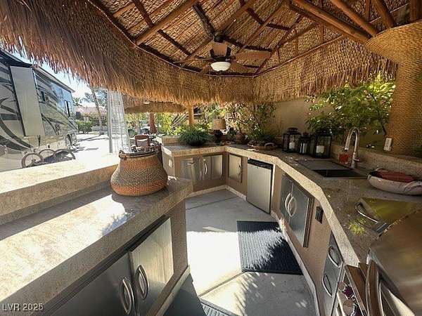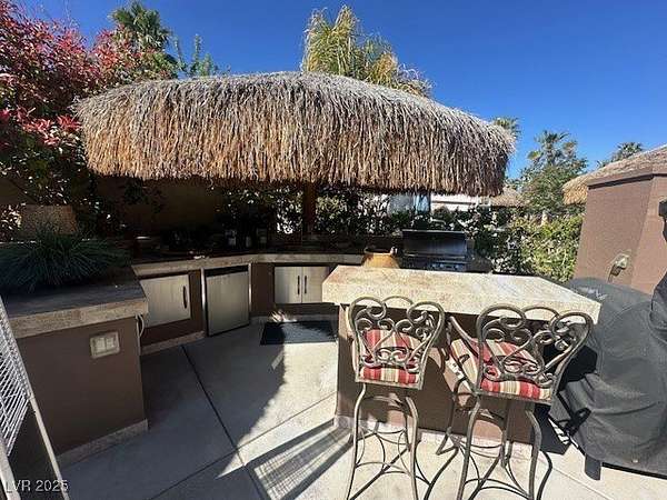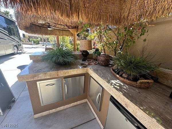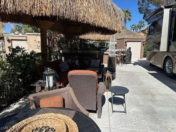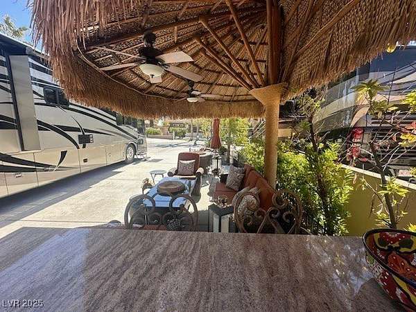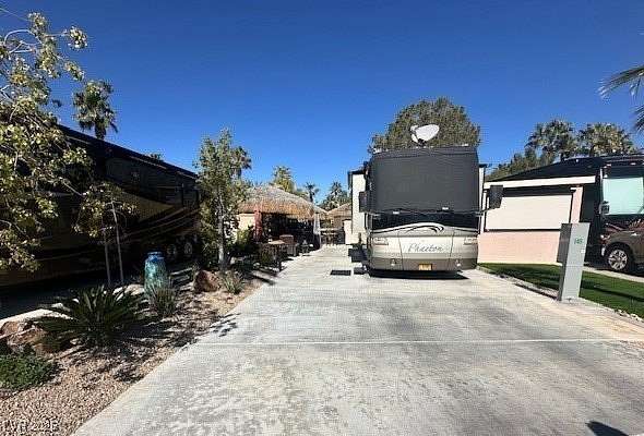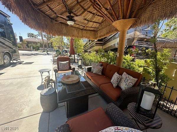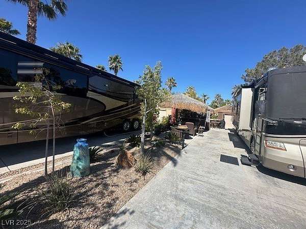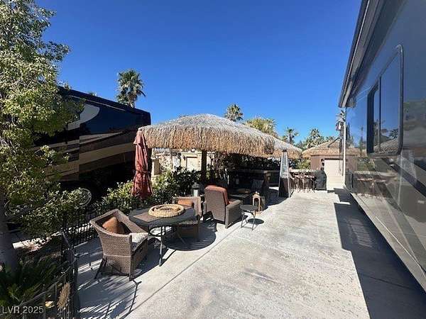 Est $2,474/moLocated within the Class A Las Vegas Motorcoach Resort, this site is immaculate and cozy! This super well-kept site features shade palapas, full outdoor kitchen with granite counters, bar seating, living room area with firepit, storage, custom lighting, and much more! This site also includes a full set of outdoor furniture and decor, full size refrigerator, freezer, washer and dryer. This one will go quick!