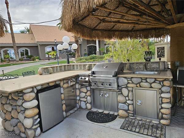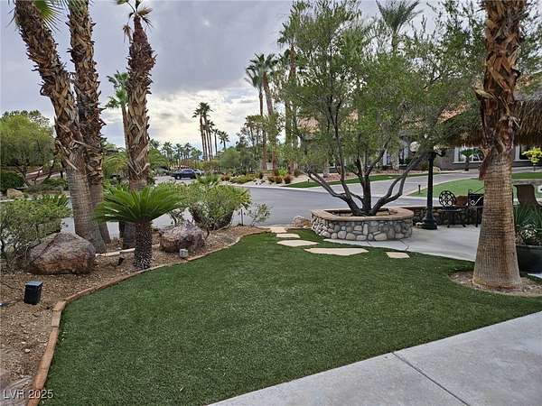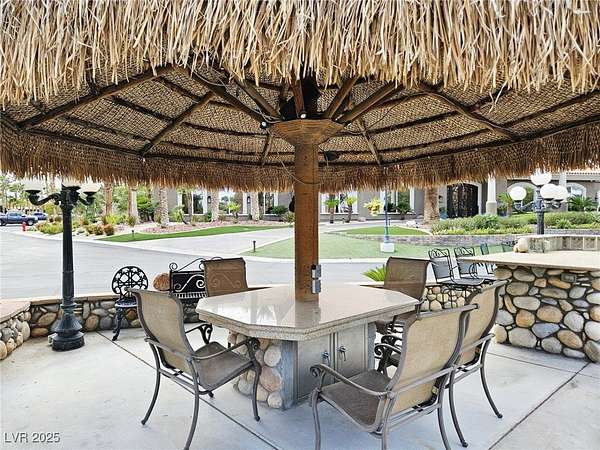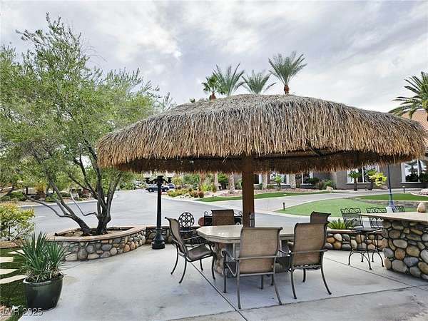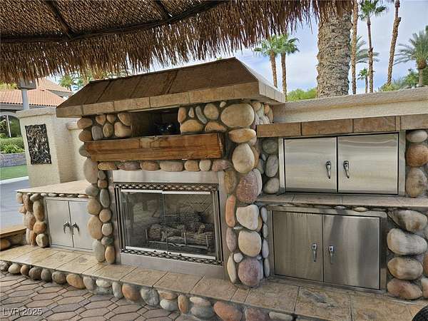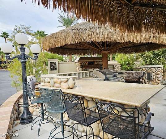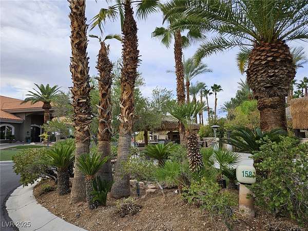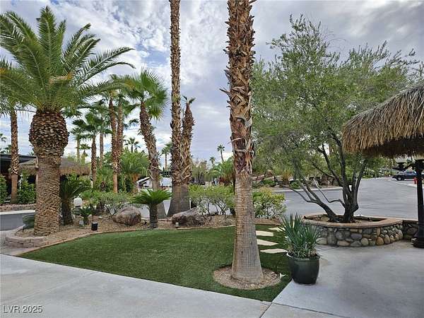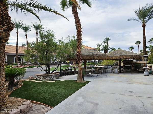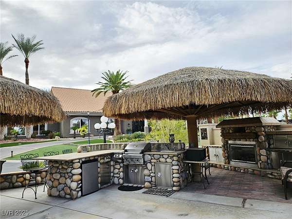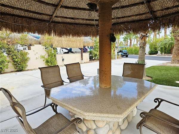 Est $3,208/moLocated within the Class A Las Vegas Motorcoach Resort, this is a huge corner site across from the main clubhouse! This gorgeous site features a river rock wall and build out shaded by two large palapas and lush landscaping with canary palm trees, kitchen, dining table, fireplace, living room area, storage sheds, furniture, and so much more! Definitely look at this one!!!
