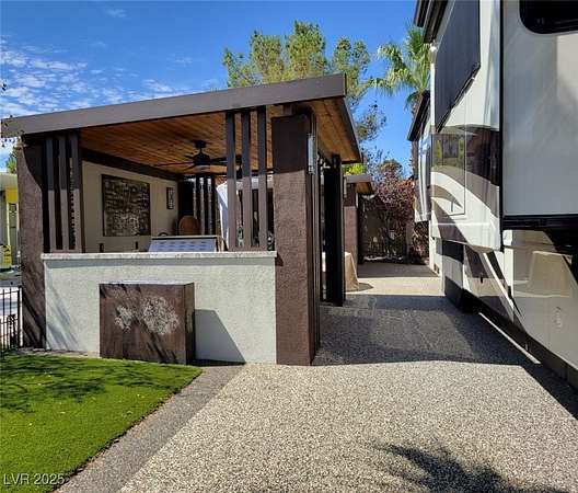 Est $3,457/moLocated within the Class A Las Vegas Motorcoach Resort, this site is one of a kind! This modern site with hard roof structures has been tastefully designed with wood accents, gorgeous granite counter tops and a coordinating pebble-tech pad. The structures encompass a full kitchen with stainless steel appliances and living space with TV and fireplace for you to enjoy outdoor living at its finest. A third structure includes a large heated and cooled storage space as well as a comfort station for your convenience. OWNER WILL CARRY!!