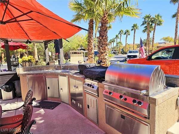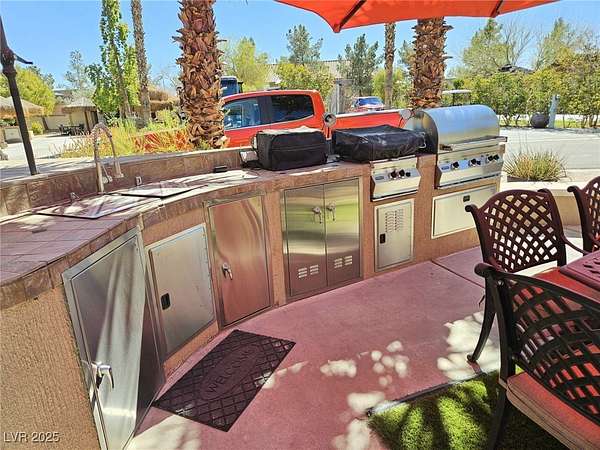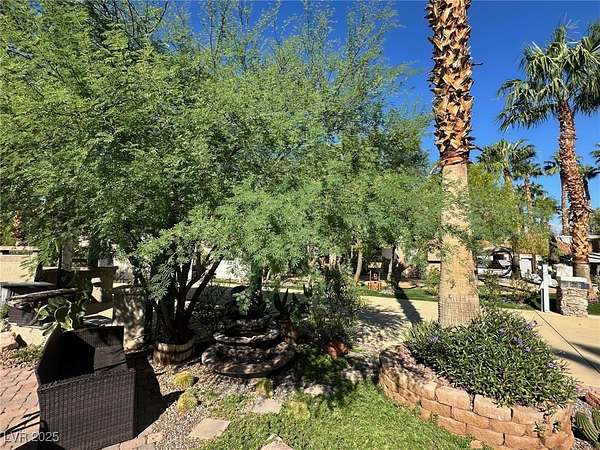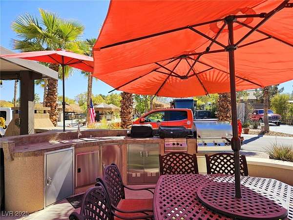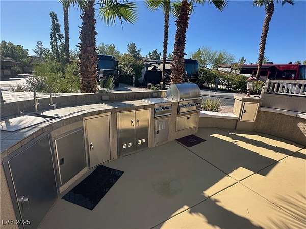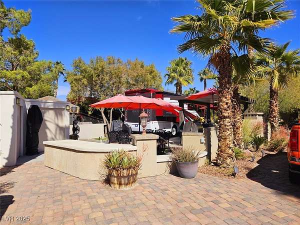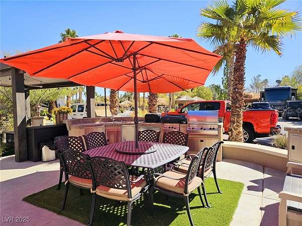 Discover luxury RV living at its finest with Lot 109 at the Las Vegas Motorcoach Resort. This expansive corner lot offers unrivaled space & features an extended paver pad, providing additional parking for your convenience. The beautifully designed desert landscape enhances the serene atmosphere, offering a perfect blend of style & low-maintenance living. A standout feature of this lot is the impressive hard roof structure that creates an inviting seating area, complete with a cozy fireplace, making it the perfect place to relax or entertain guests year-round. A fully equipped outdoor kitchen is perfect for preparing meals while enjoying the outdoors & has plenty of seating for family & friends to gather. Additionally, the large storage structure provides ample room to keep everything organized & accessible. Whether you're looking for a retreat or an entertainer's paradise, Lot 109 offers it all. Don't miss the opportunity to own this exceptional piece of real estate at the LVM Resort!