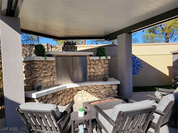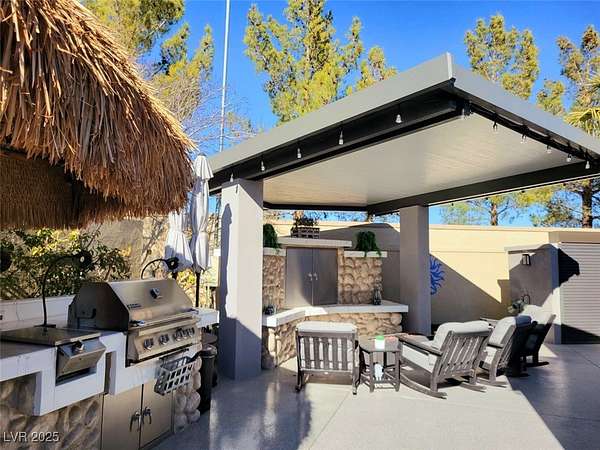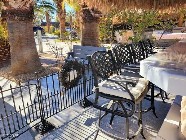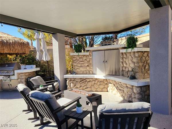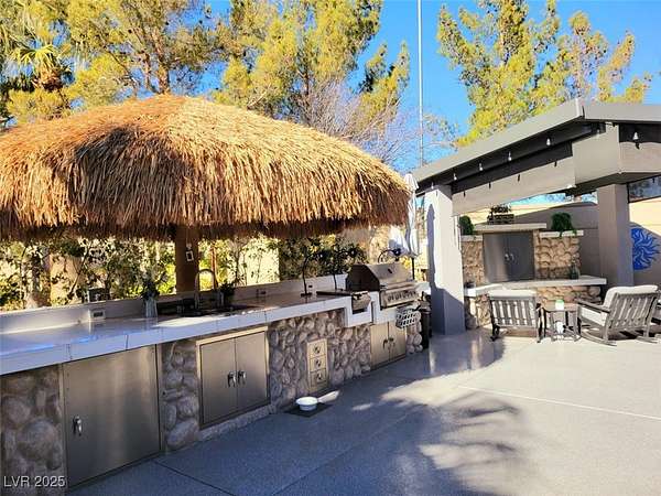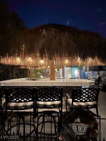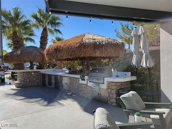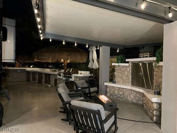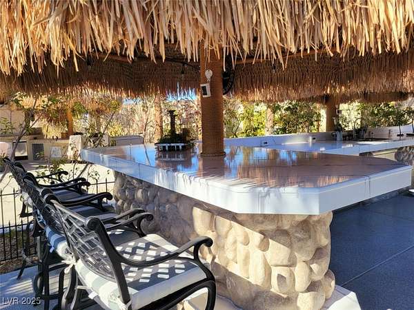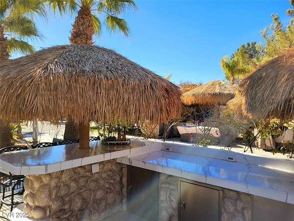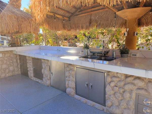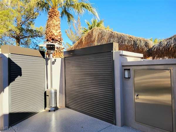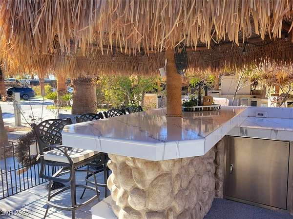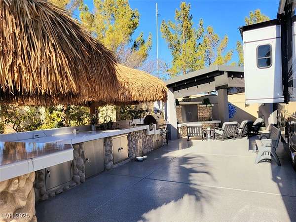 Est $2,992/moLocated within the Class A Las Vegas Motorcoach Resort, this manicured south facing perimeter site is fully decked out with two large shade palapas that encompass a full kitchen with bar top seating and lighting as well as a large cantilever structure with roll down shades where you can relax in front of the fire and watch TV. There's also epoxy coated flooring, large storage areas with roll up doors and hookups for a washer and dryer just to name a few of the added extras this site offers.