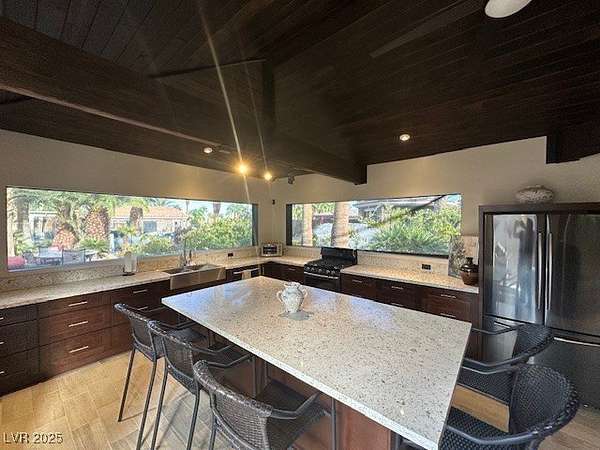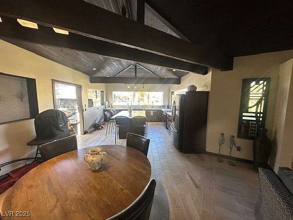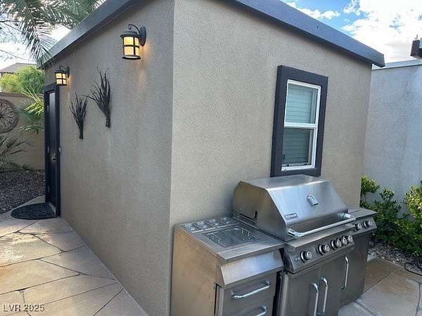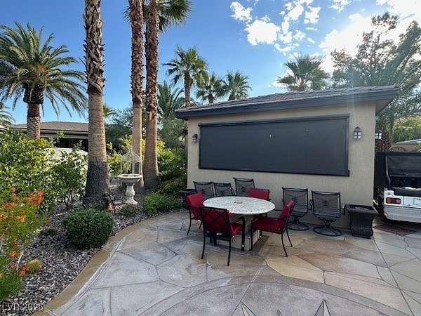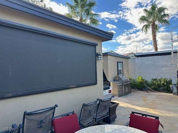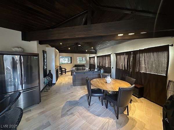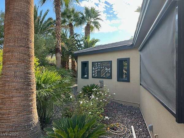 Experience resort-style living in this beautifully upgraded, fully enclosed structure located on an unique and oversized lot within the prestigious Las Vegas Motorcoach Resort. Thoughtfully designed for comfort and entertaining, this property boasts a spacious living area complete with a cozy fireplace, wood beam accents, and motorized roll-up shades for effortless indoor-outdoor living. The full kitchen features sleek stainless-steel appliances, granite countertops, and upgraded tile flooring, flowing seamlessly into a stylish dining area. A private bathroom and dedicated storage space add both convenience and functionality. Step outside to enjoy meticulously landscaped grounds and multiple outdoor seating areas, perfect for relaxing or hosting guests. Whether you're looking for a high-end getaway or a full-time retreat, this rare oversized lot offers the perfect blend of comfort, elegance, and motorcoach luxury. Total square footage estimated at 860 square feet of interior.