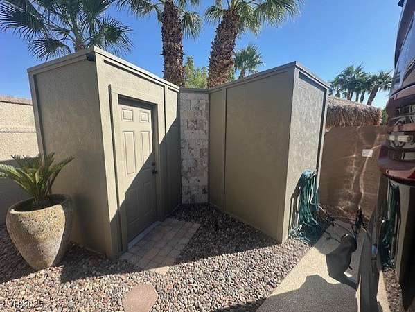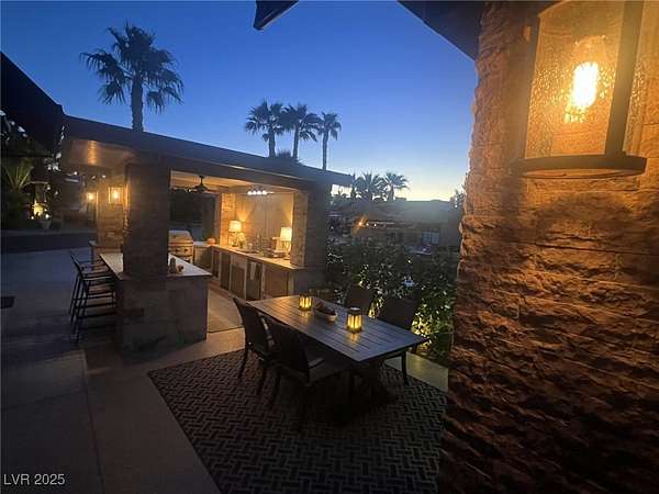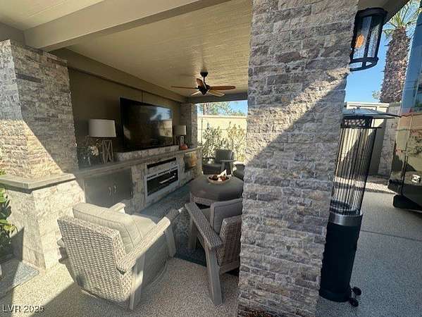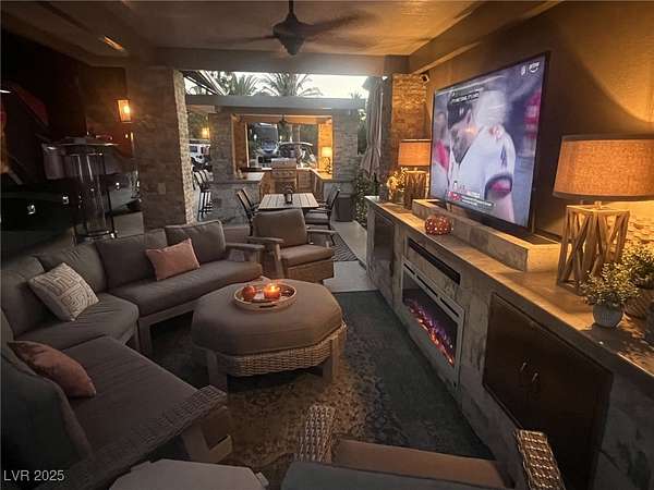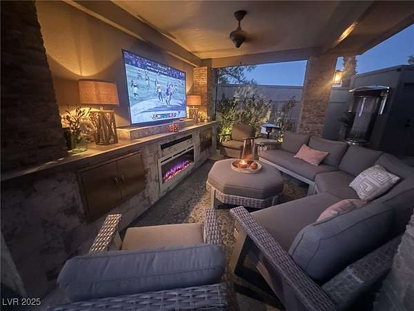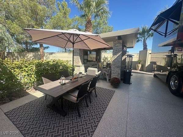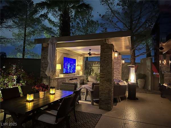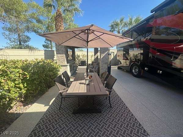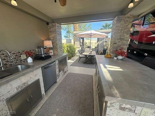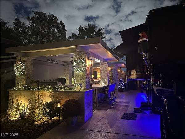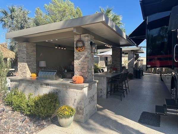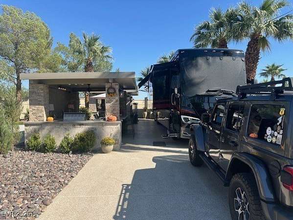 Located within the Class A Las Vegas Motorcoach Resort. IMMACULATE BUILD OUT!! This amazing site features a hard roof structure with a gourmet kitchen, stainless steel appliances, bar seating and an outdoor dining table for four. You can relax in a spaciously covered entertainment area with a large pop-up TV, electric heating fireplace, and comfortable seating for eight. There's also a comfort station with a toilet and sink, a water filtration/softener system (including hookup for your coach), and an epoxy driveway. Located on the outer perimeter of the resort, this lot offers additional privacy and just a short walk to the main clubhouse where you can take advantage of the resort's weekly social events, fitness center, sauna, pool, mini-golf course, jacuzzis, pickleball and tennis courts.