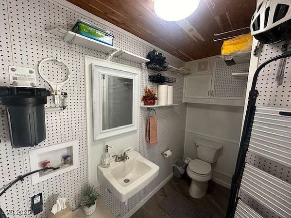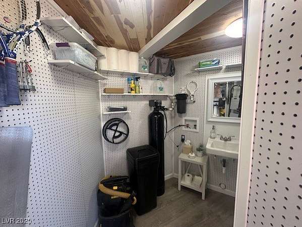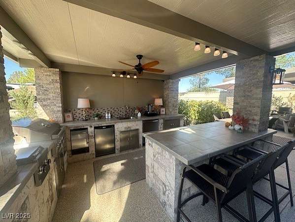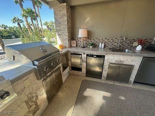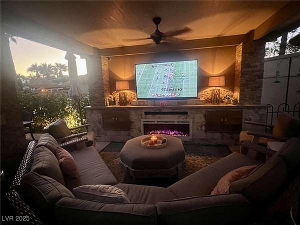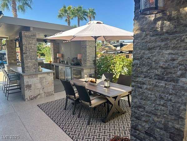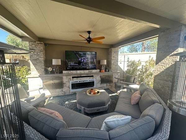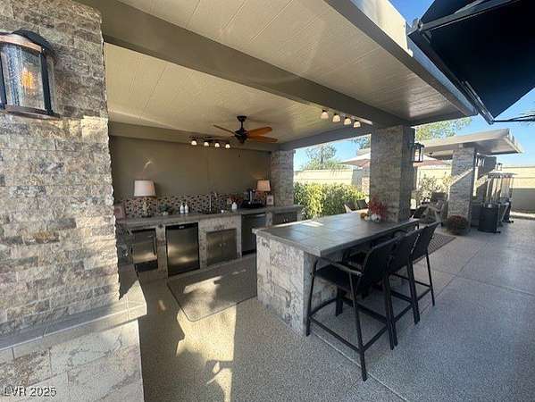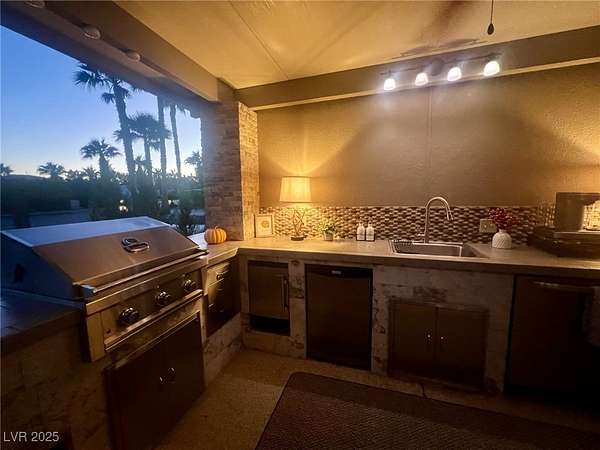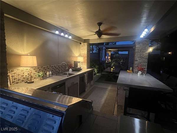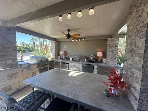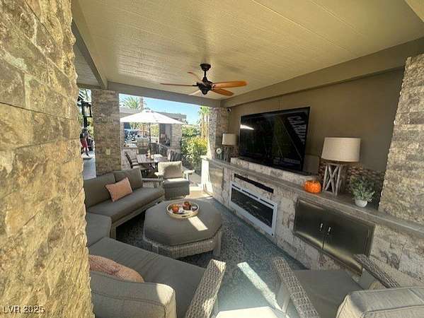 Located within the Class A Las Vegas Motorcoach Resort. IMMACULATE BUILD OUT!! This amazing site features a hard roof structure with a gourmet kitchen, stainless steel appliances, bar seating and an outdoor dining table for four. You can relax in a spaciously covered entertainment area with a large pop-up TV, electric heating fireplace, and comfortable seating for eight. There's also a comfort station with a toilet and sink, a water filtration/softener system (including hookup for your coach), and an epoxy driveway. Located on the outer perimeter of the resort, this lot offers additional privacy and just a short walk to the main clubhouse where you can take advantage of the resort's weekly social events, fitness center, sauna, pool, mini-golf course, jacuzzis, pickleball and tennis courts.