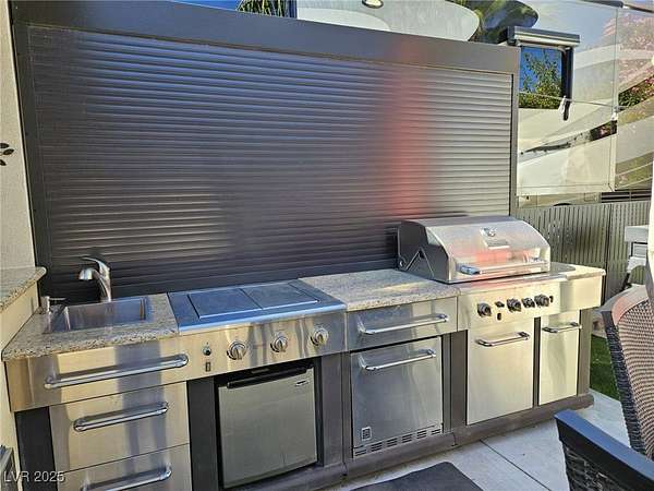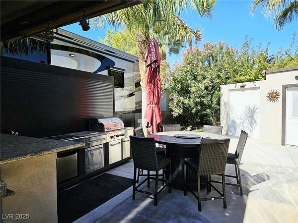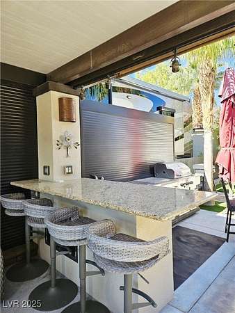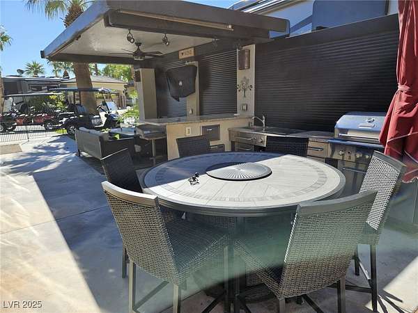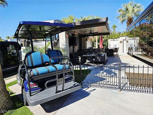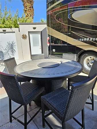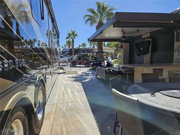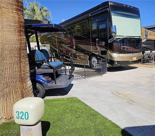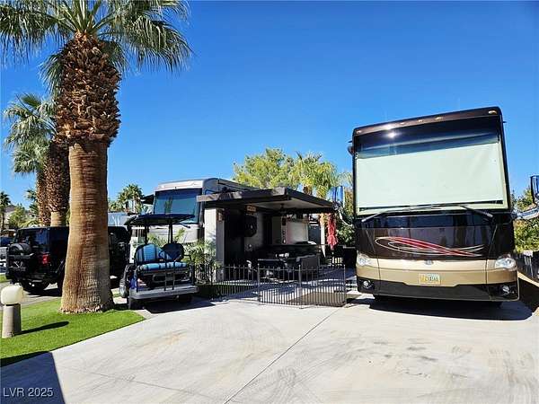 Est $2,618/moLocated within the Class A Las Vegas Motorcoach Resort, this Gorgeous south facing site has an extended pad with hard roof structure and roll down shades that encompass a tv sitting area, kitchen, bar area, comfort station, storage sheds, low maintenance landscaping, and so much more! This is truly a phenomenal site!