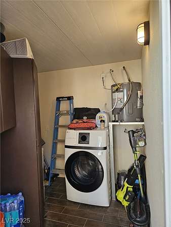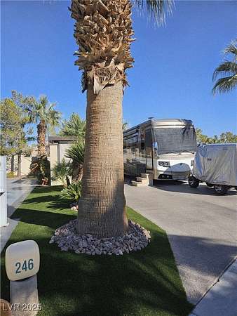 A True LVM Stunner! This beautifully appointed site features hard-roof structures with motorized privacy shades, creating an intimate retreat. Under that elegant roof lies a full entertainer’s dream with an outdoor kitchen equipped with a built-in BBQ, range/oven, dishwasher, refrigerator, and bar seating. Adjacent sits a cozy living room area, complete with a fireplace and a large-screen TV, offering refuge in style and comfort. There’s a comfort station, plus a combined laundry and storage room with cabinets, so everything stays organized and easily accessible. Outside, the landscape is low maintenance with synthetic turf and manicured palm trees, all framed by an elegant epoxy driveway for a clean, refined look. This lot is more than just a place to park, it's a luxury lifestyle, tailored for entertaining, relaxing, and truly calling Las Vegas home.
