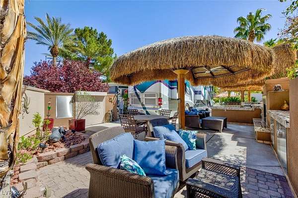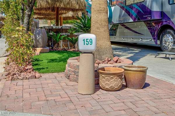 Est $2,651/moLocated within the Class A Las Vegas Motorcoach Resort, this site immaculate and cozy tropical site has plenty of privacy and no coach behind! Located very close to the swimming pools, club house, gym, and sauna. This gorgeous site features a water feature, lush landscaping, gourmet kitchen with BBQ, side burner, refrigerator, wine cooler, sink, multiple palapas with ceiling fans, bar, living room area with TV niche, fireplace, patio furniture, storage shed, and much more. Also, brand new granite counter tops!