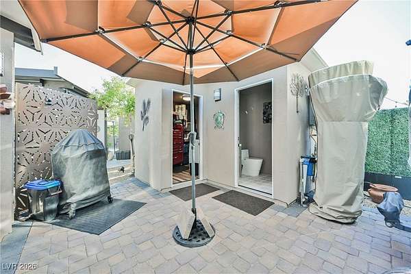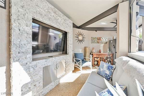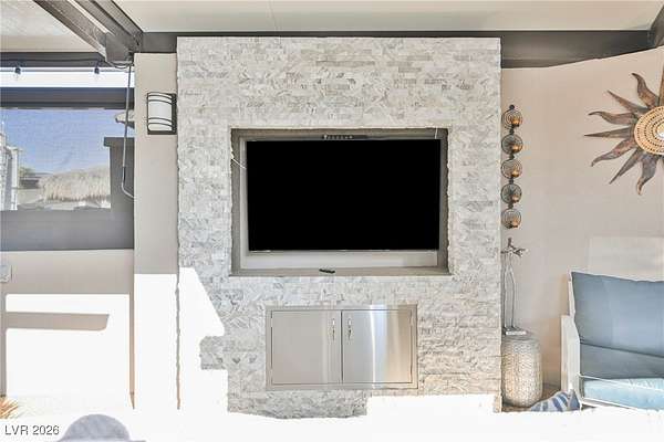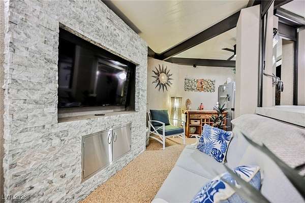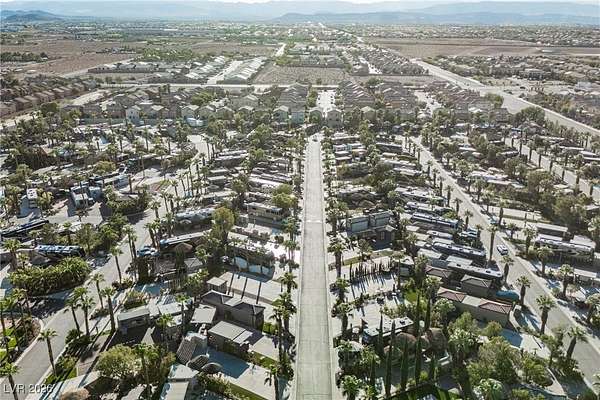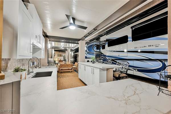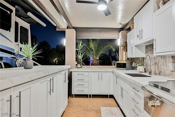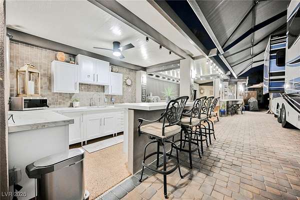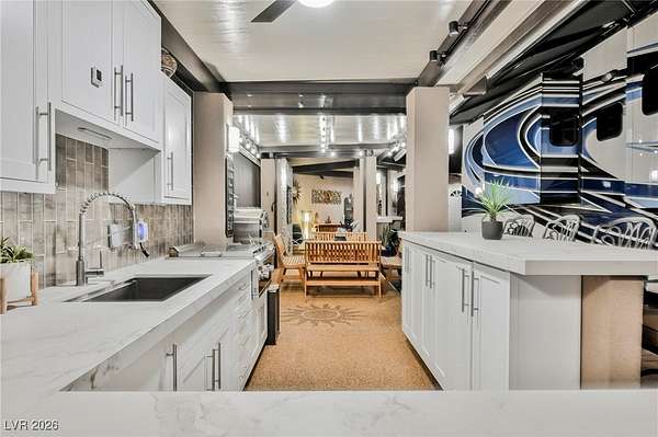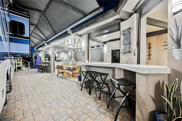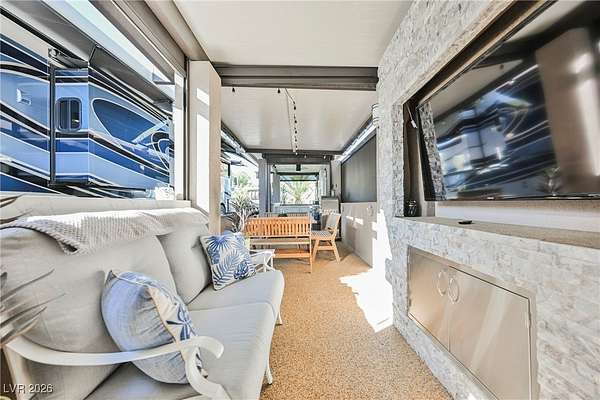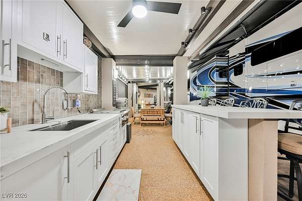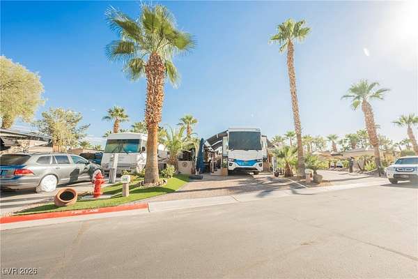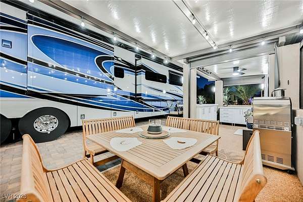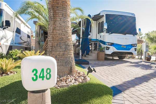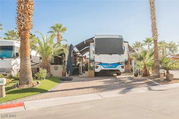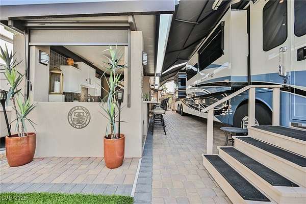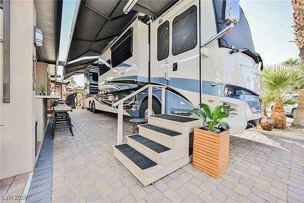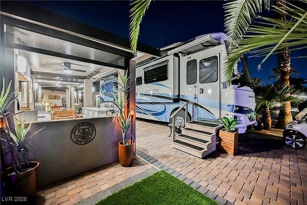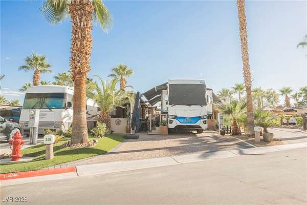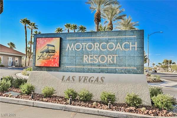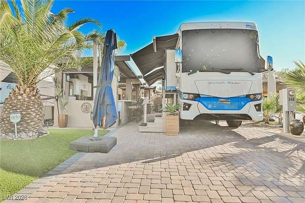Located in the 24 hour Guard Gated Las Vegas Motorcoach Resort, a Class A only facility. This private & highly sought after north facing lot boasts a Custom modern 2022 build out with a complete hard covered kitchen, living room and dining area! Also a separate building which houses a private bathroom & large storage area with full size washer and dryer. The kitchen consists of Challenger custom white cabinetry, Dekton countertops, Blaze 30"griddle and standalone Pizza/bakery oven. Living room with enclosed TV, 2nd bar also with Dekton counter and a full size refrigerator. Includes solar shades, fans, pebble stone floors in living areas and pavers on the RV Pad. LVMR Amenities include 5 pools, 6 spas, 4 laundry facilities, showers, Fitness Center and Clubhouse with owners lounge, bar ballroom, card room, theater, room pickleball, courts, putting green and much, much more!! Minutes from the famous Las Vegas strip! And conveniently located near shopping & restaurants. A MUST SEE!