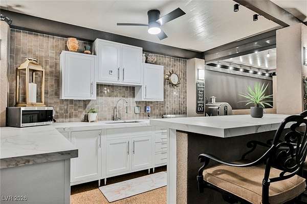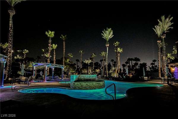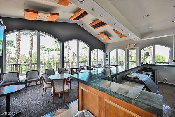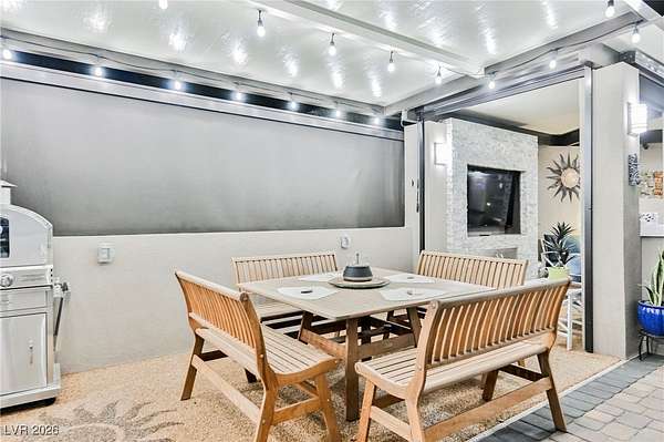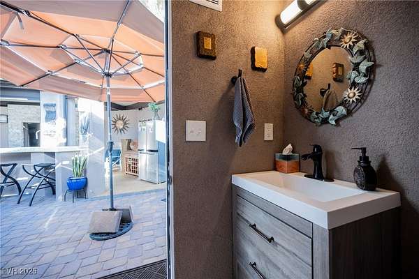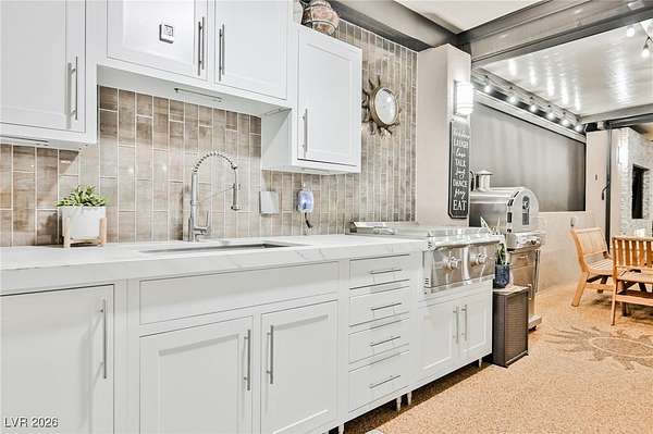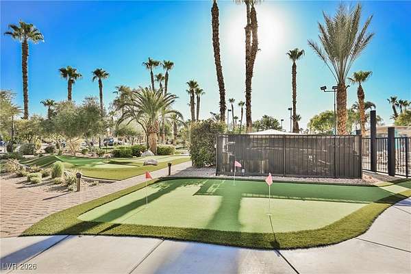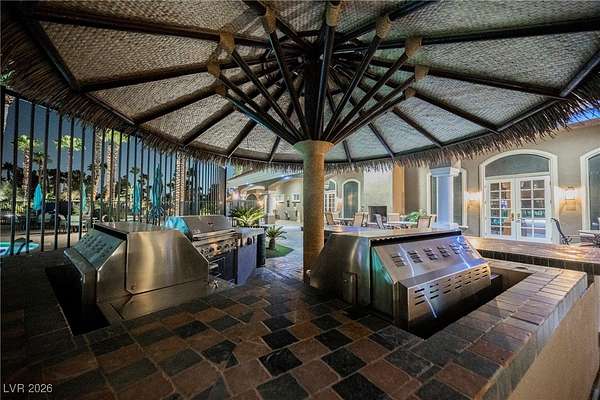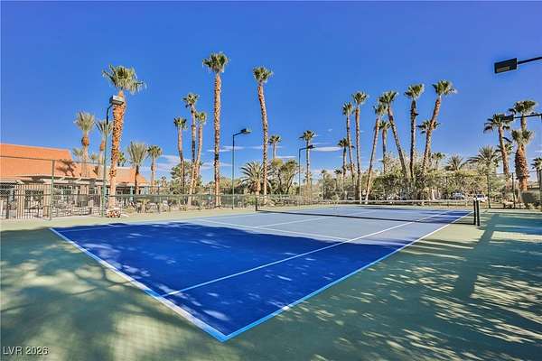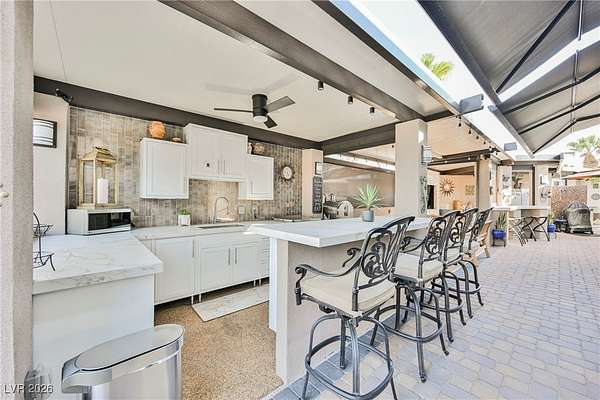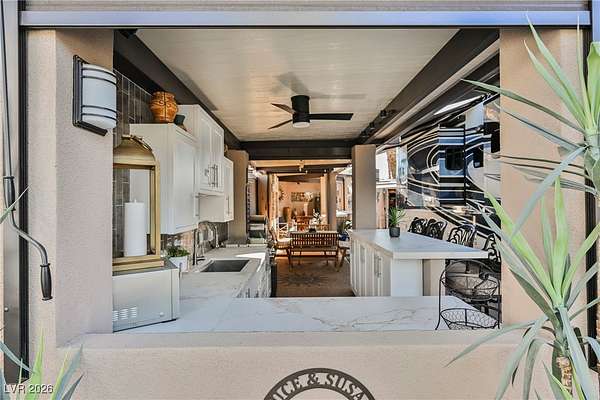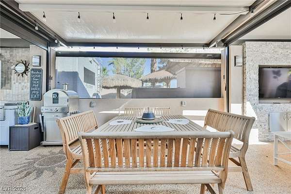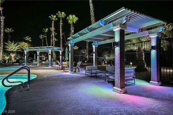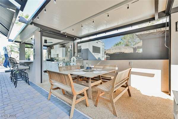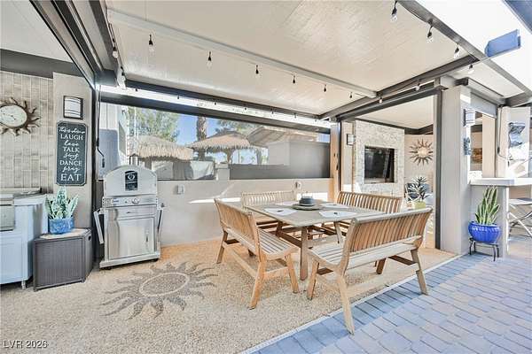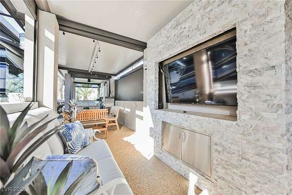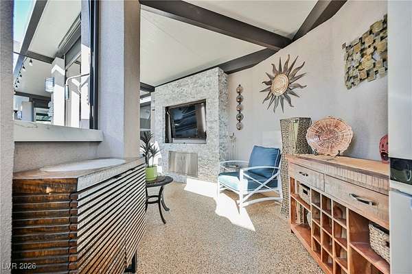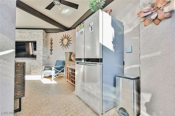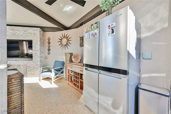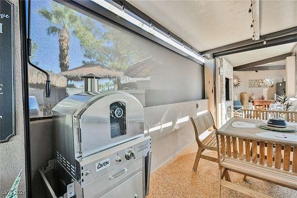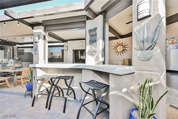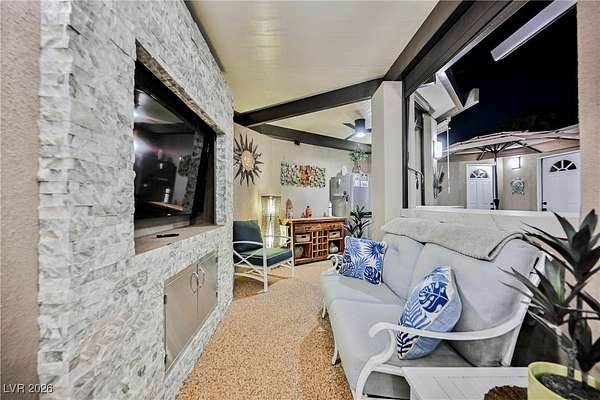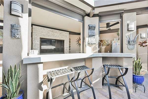 Located in the 24 hour Guard Gated Las Vegas Motorcoach Resort, a Class A only facility. This private & highly sought after north facing lot boasts a Custom modern 2022 build out with a complete hard covered kitchen, living room and dining area! Also a separate building which houses a private bathroom & large storage area with full size washer and dryer. The kitchen consists of Challenger custom white cabinetry, Dekton countertops, Blaze 30"griddle and standalone Pizza/bakery oven. Living room with enclosed TV, 2nd bar also with Dekton counter and a full size refrigerator. Includes solar shades, fans, pebble stone floors in living areas and pavers on the RV Pad. LVMR Amenities include 5 pools, 6 spas, 4 laundry facilities, showers, Fitness Center and Clubhouse with owners lounge, bar ballroom, card room, theater, room pickleball, courts, putting green and much, much more!! Minutes from the famous Las Vegas strip! And conveniently located near shopping & restaurants. A MUST SEE!