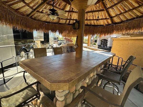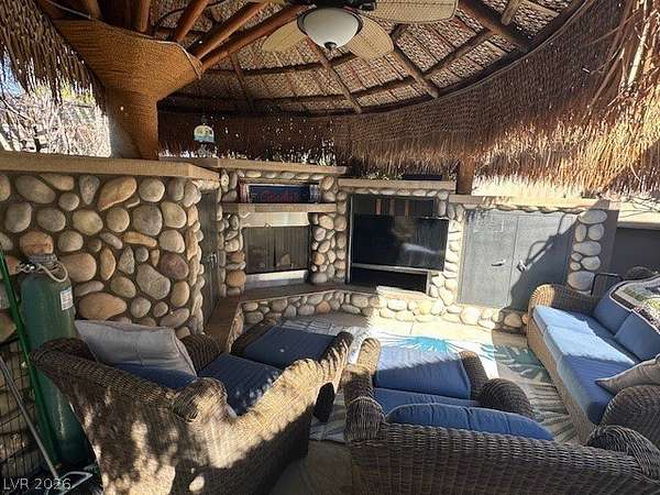 Est $2,557/moThis beautiful outdoor living space is designed for relaxation, entertainment, and enjoying the vibrant lifestyle of Las Vegas. This site features a full outdoor kitchen with generous countertop seating, making it ideal for enjoying outdoor meals. A built-in BBQ sits beneath oversized palapas that provide both shade and a touch of tropical charm. Adjacent to the kitchen, a covered sitting area complete with a cozy fireplace and a dedicated TV niche for outdoor movie nights or game-day gatherings. This site is a must see!