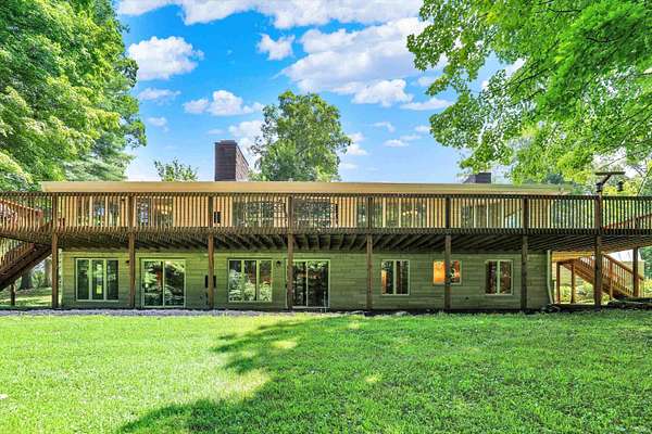 Nestled on approximately 75 acres just minutes from Bloomington, Bedford, and Lake Monroe, this impressive 6,000-square-foot residence offers both privacy and convenience. The home features 6 spacious bedrooms and 4.5 baths, including a stunning great room with soaring cathedral ceilings and a cozy wood-burning fireplace. The well-appointed kitchen with custom cabinetry throughout and new quartz counters & appliances. Designed to accommodate gatherings large or small, the home includes two additional fireplaces, two libraries, abundant storage, and a relaxing sauna. Multiple patio doors provide easy access to the expansive wrap-around deck, which overlooks serene woodlands, as well as a covered patio on the lower level--perfect for entertaining or simply enjoying the view. An attached greenhouse offers year-round gardening convenience. The property itself is a blend of open fields and mature woods, with a picturesque pond nearby. A 40' x 80' pole building adds valuable space for hobbies, storage, or equipment. Set well back from the road along a long driveway, the home enjoys exceptional privacy. The home is equipped with high speed internet. With endless possibilities, this unique property is truly a must-see!