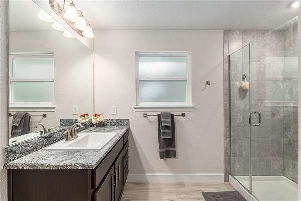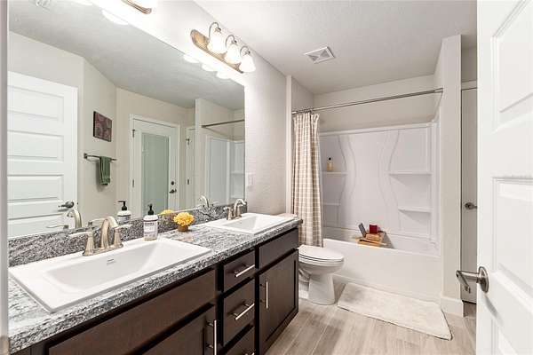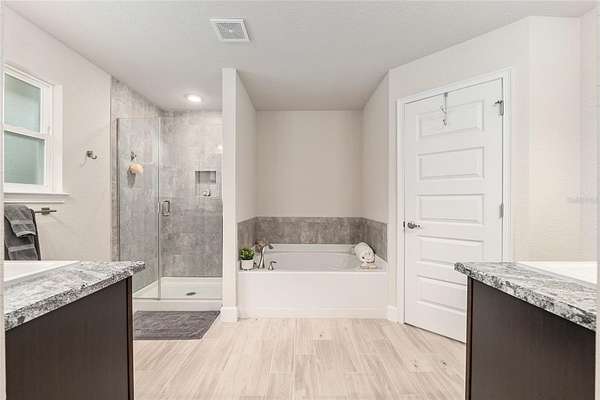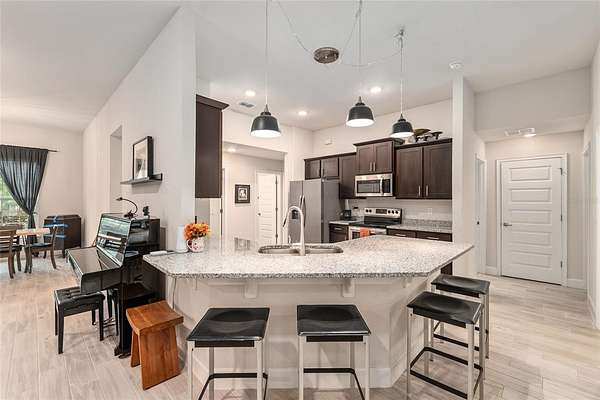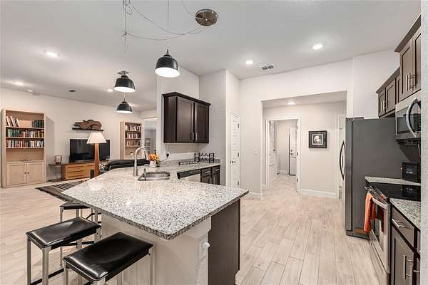 Inside, the home features an open-concept layout ideal for both relaxing and entertaining. Natural light pours through tall windows, filling the living spaces with warmth. You’ll find 4 spacious bedrooms, a dedicated home office, and a 3 way split layout that balances comfort with functionality. The home and owner's suite boast stunning wood look tile, while the remaining 3 bedrooms have carpet. The kitchen has ample granite counter space and is open to both the dining room and the breakfast nook. There is a comfortable seating for 4 at the bar, so the cook will never be left out of the fun!