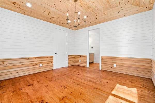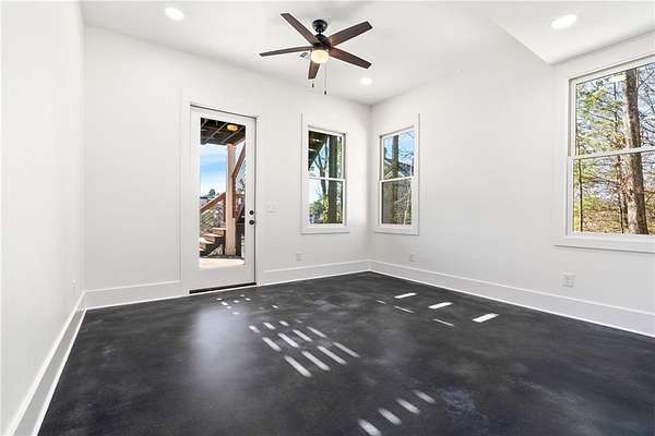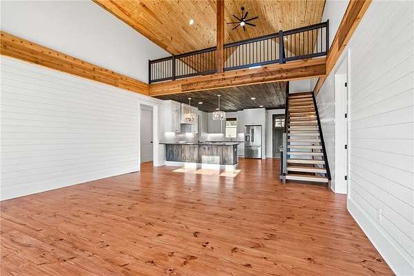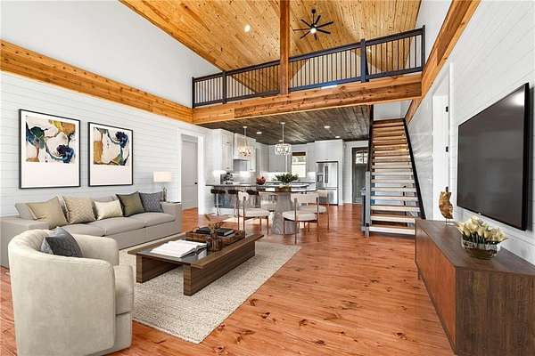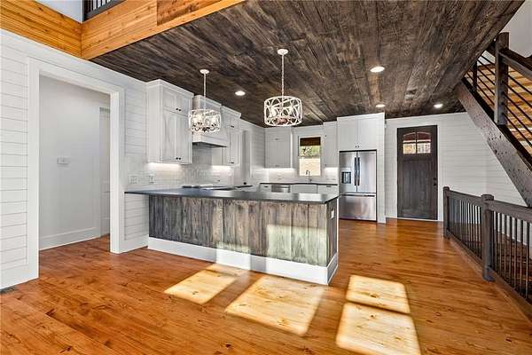 The thoughtfully designed interior features 4 bedrooms and 4 full bathrooms, with two bedrooms on the main level and two on the daylight lower level. Open-concept living and kitchen areas are filled with natural light and showcase pine flooring, tongue-and-groove ceilings, cedar trim, shiplap accents, and a floating staircase crafted from reclaimed factory timbers. The kitchen offers custom cabinetry, dark slate-colored quartz countertops, a full appliance package, and a stained white oak ceiling and bar wrap. The main-level primary suite provides a private retreat with a spa-style ensuite featuring a soaking tub, tiled shower, double vanity, water closet, and a spacious double-sided walk-in closet. Additional highlights include a custom laundry room with furnished washer and dryer, an upper loft, and a lower-level family room with kitchenette, guest bedrooms, luxury-tiled baths, stained concrete flooring, and a reinforced concrete safe room.