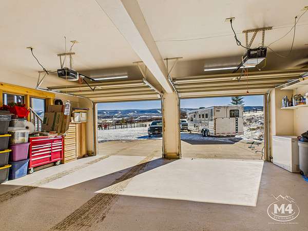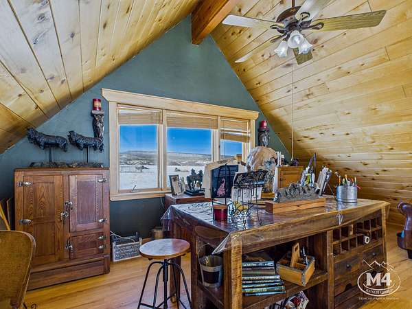 Supporting ranch operations is a three-bay shop, featuring one electric overhead door, two manual doors, and sliding barn doors. A dedicated tack room or workshop provides space for gear storage, equipment maintenance, freezers, or future upgrades, with sufficient power to accommodate a walk-in cooler if desired. Multiple water taps serve the residence and operational areas, and two ponds near the lodge capture seasonal runoff.