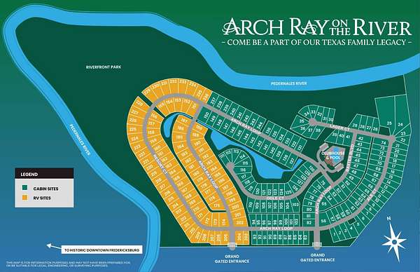From Johnson City on US Hwy 290 entering Fredericksburg, Arch Ray Resort is on the right. Go through the gates, turn left at the first road, and follow Arch Ray Loop to the property.