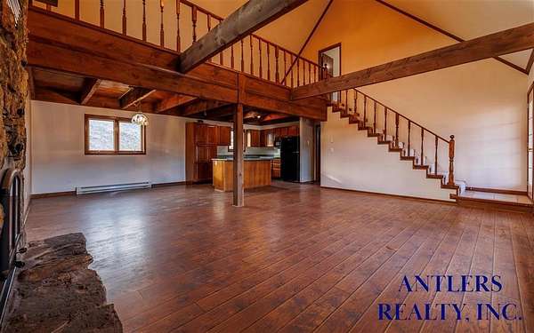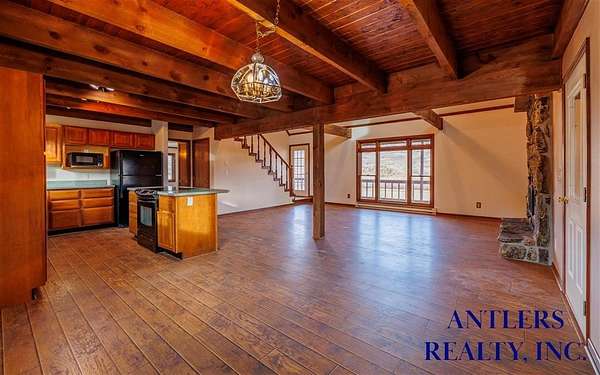 This four-bedroom, three-bath home offers a flexible multi-level layout with expansive mountain views. The design includes main-level living, a loft, and a walkout basement, creating functional and well-defined space throughout the home. Interior features include exposed wood beams, a moss rock fireplace, and a tile entryway at the base of the staircase. The loft level includes a bedroom with an ensuite bath and walk-in closet, while the primary bedroom also features an ensuite, allowing for separation within the floor plan. Two additional bedrooms and a full bath are located in the walkout basement. A covered porch extending the full length of the front of the house provides sheltered outdoor space and captures the surrounding mountain views. The walkout basement offers exterior access and natural light, enhancing the overall usability of the lower level.