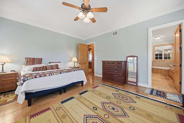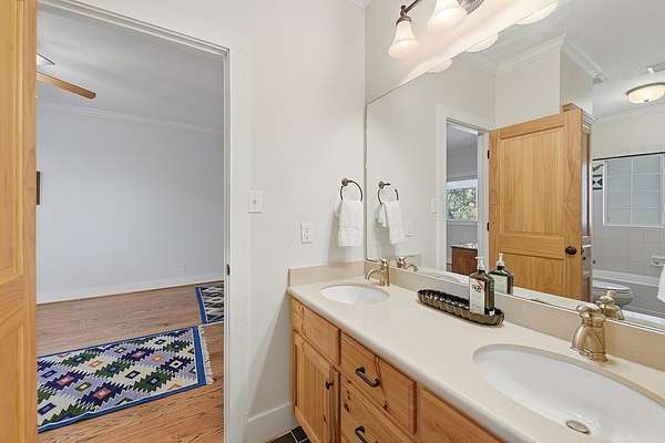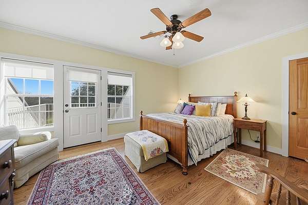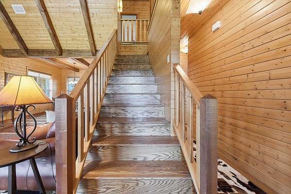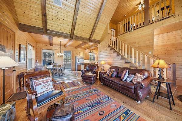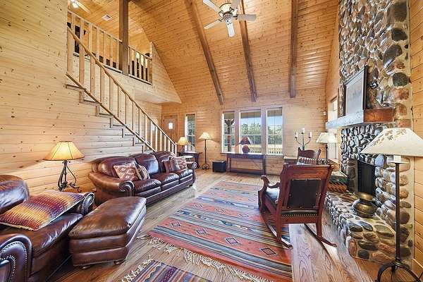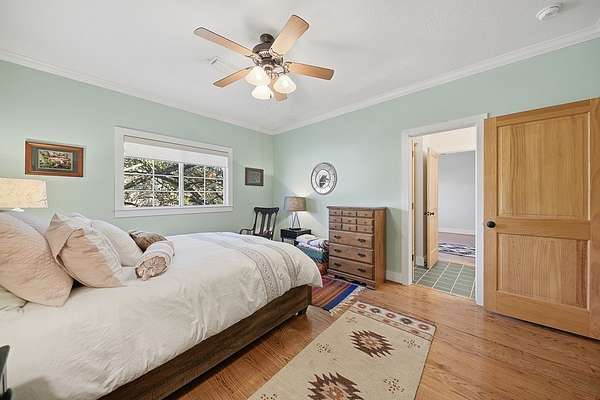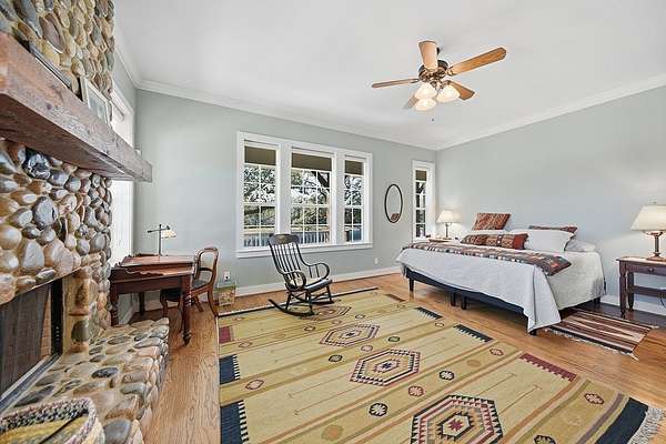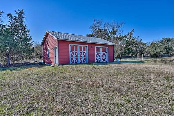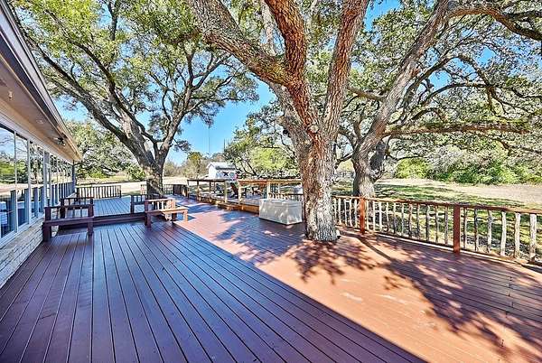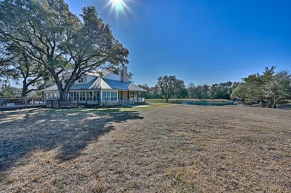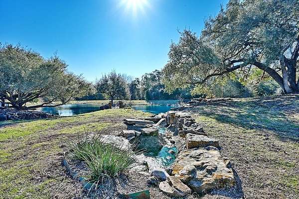 Set on approximately 23.15 acres, this Brenham property features a scenic pond with a custom, old-world-style stone bridge, waterfall, and creek-style water features. The bridge spans the pond and leads to a small island shaded by mature oak trees. Gently sloping grassy banks, natural stone accents, and stone walkways create a private, park-like setting. The main residence built by Mr. (senior) RL Tiemann Construction offers classic Hill Country architecture with a semi wraparound porch, stone exterior, and metal roof. Large windows provide views of the pond and surrounding acreage. Interior features include warm wood finishes, exposed beams, hardwood floors, and wood-paneled ceilings. The home includes 4 bedrooms and 4B/R. The kitchen offers ample cabinetry, generous counter space, and a center island. Living areas feature a stone fireplace. A barn-style outbuilding with metal roofing provides additional storage or functional space. Mature oak trees offer shade and privacy throughout the property.