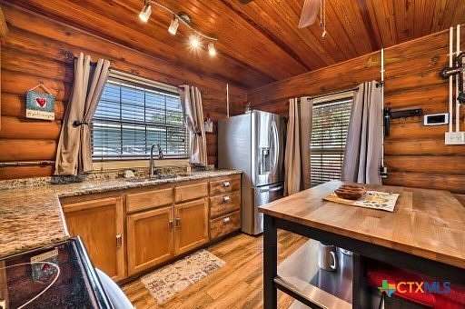 This charming two-story, fully furnished log cabin home offers a tranquil escape on nearly 26 acres of meticulously maintained land, secured behind a gated entrance for added privacy. The property boasts a spacious carport suitable for vehicle storage, alongside an additional carport ideal for RV or boat storage, complemented by a full RV hook-up for convenient hosting. The interior is cozy with an open floor plan and wood flooring throughout, featuring multiple ceiling fans and large windows that flood the living spaces with natural light. The living room, centered around a cast-iron woodburning stove, seamlessly connects to the bright dining and kitchen areas. The kitchen shines with modern touches, including track lighting, stainless steel appliances, granite countertops and ample cabinetry, with a spacious kitchen window overlooking picturesque surroundings. Upstairs, a large bedroom sanctuary features plush carpet flooring, multiple ceiling fans, a spacious walk-in closet and private access to both balconies. Two bathrooms provide additional convenience. Outside, unwind in the heated pool or hot tub surrounded by lush greenery and tranquil views. Enjoy outdoor dining on the covered patio or take in breathtaking scenery from the front and rear balconies. Located near several parks and the Iron Bridge Wildlife Management Area, this haven offers endless opportunities for outdoor exploration, perfect for nature lovers seeking serenity and comfort.