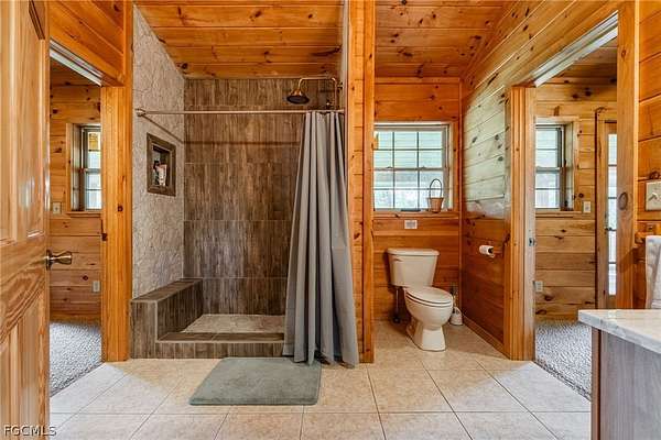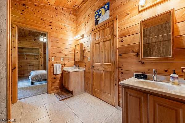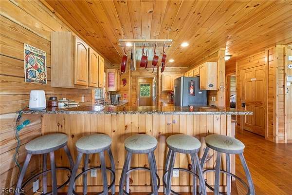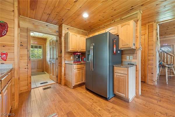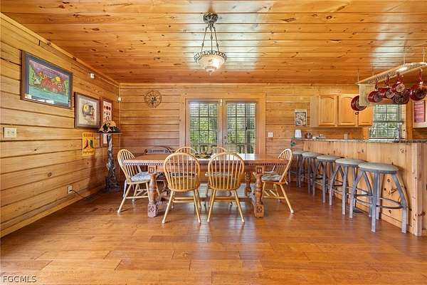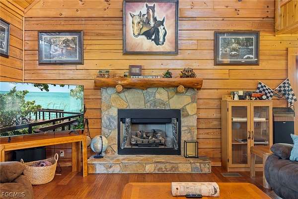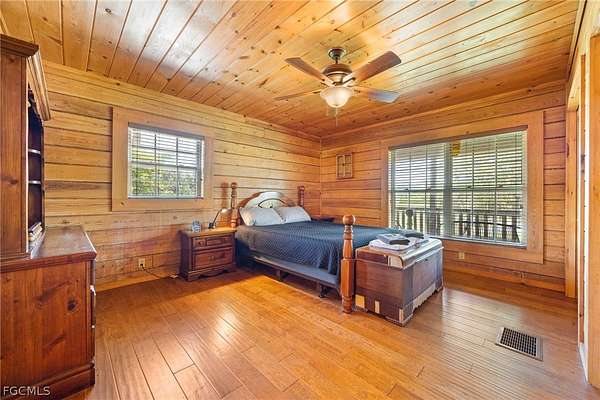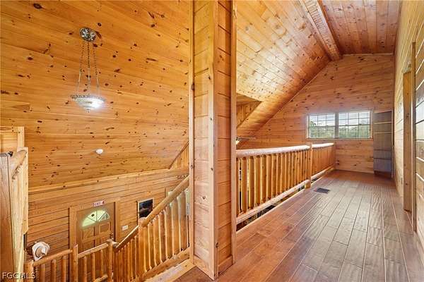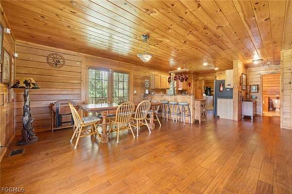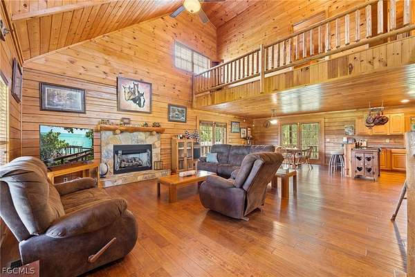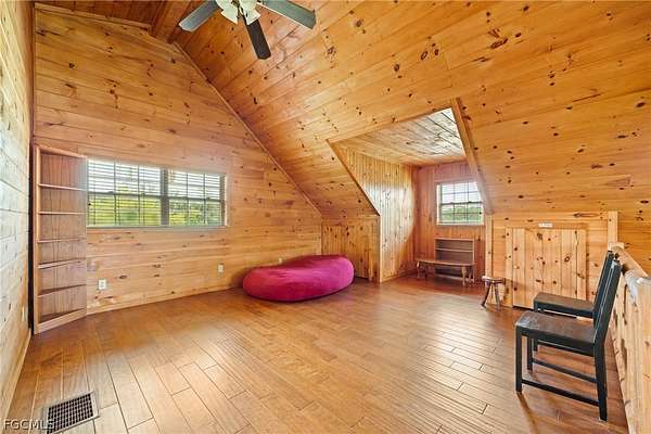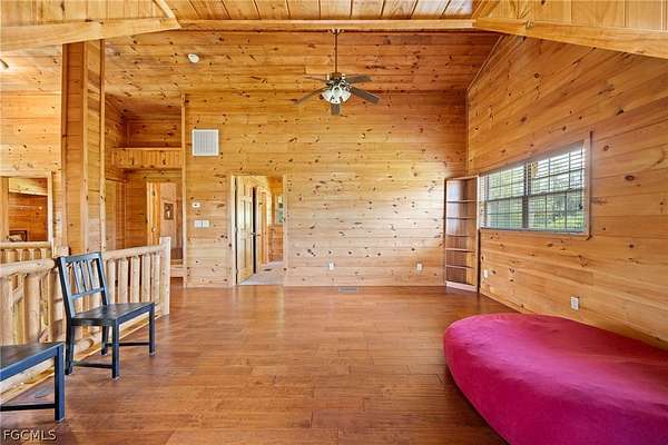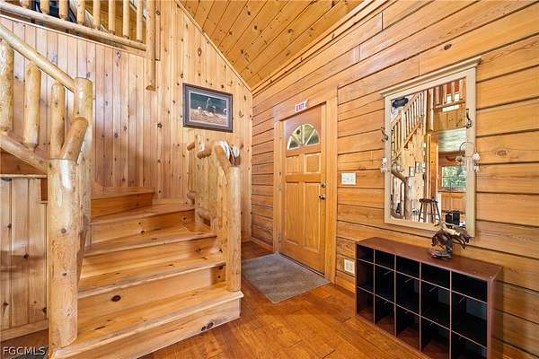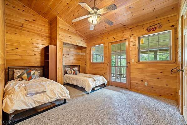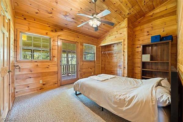 Tucked among mature trees in the heart of Montura Ranches, this unique 2,200 sq ft Red Cypress cabin blends rustic character with modern practicality on 2.5 fully fenced acres. Built of Red Cypress -this home is designed for lasting beauty and low maintenance. Inside, you'll find rich woodwork throughout that brings warmth and authenticity to the living spaces. The fireplace in the living room and wrap around decks are so inviting. The primary suite is conveniently located downstairs, while two guest bedrooms sit upstairs along with a large loft area-perfect for an office, studio, or media space. Outside, the acreage is ready for your lifestyle with a large utility shed and a chicken coop/cage, plus plenty of room for gardens, animals, and outdoor toys.
