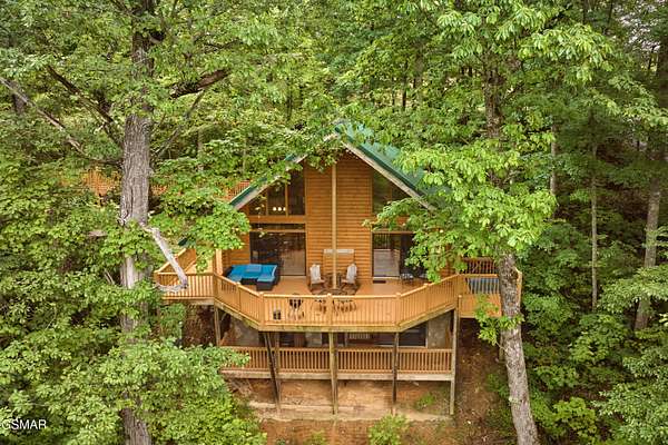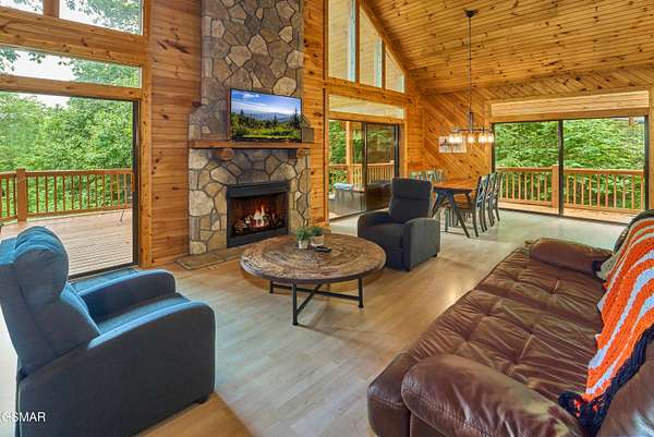 With almost 2.5 acres of wooded and partial mountain views, this private log cabin is perfect for residential living or an investment property! More rental potential available, too! The open floor plan, tall cathedral ceilings, large windows and triple set of sliding doors open up the cabin and make it a perfect space for entertaining and overflow out onto the upper deck. 2bd/2.5ba and sleeps 8 guests comfortably on all beds (has rental permit with Pittman Center). The new owner can add more sleeping space with a sofa bed if preferred. Only rented through Airbnb, buyers can add more rental platforms for additional revenue. The primary suite with whirlpool tub and bedrooms are located downstairs. The primary and secondary bedrooms have sliding door access to the lower back deck. The downstairs level has 9' ceilings, too! Want quiet from the crowds, but a quick drive to attractions? This cabin is only 20 minutes to downtown Gatlinburg, making this a ''perfect location, spacious accommodations, beautiful view... with pool table and hot tub! Quick trips to Gatlinburg and surrounding areas!'' Guests also say, ''The cabin had everything necessary for relaxation: a pool table, a hot tub, two spacious decks, and a welcoming view. It was tucked back into the woods which meant there was no road noise - making it perfect for listening to and watching the local wildlife [bears from the back deck]. 5/5 would recommend!'' The owner did rent to friends and family, which is not reflected in the rental revenue. *Some drone photography was used*